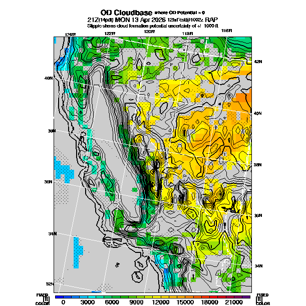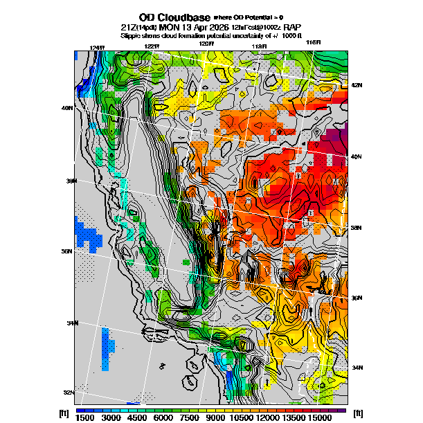 OvercastDevelopment Cloudbase Cloudbase contours are plotted only where that cloudbase is theoretically expected.  See "OvercastDevelopment Potential" and "OvercastDevelopment Cloudbase" parameter descriptions below for more information.  This composite is useful only for locations where the actual potential threshold for OD cloud production agrees with the theoretically-predicted value of zero.