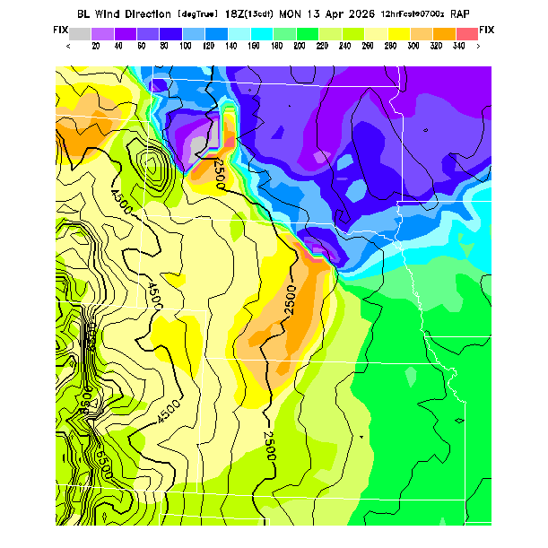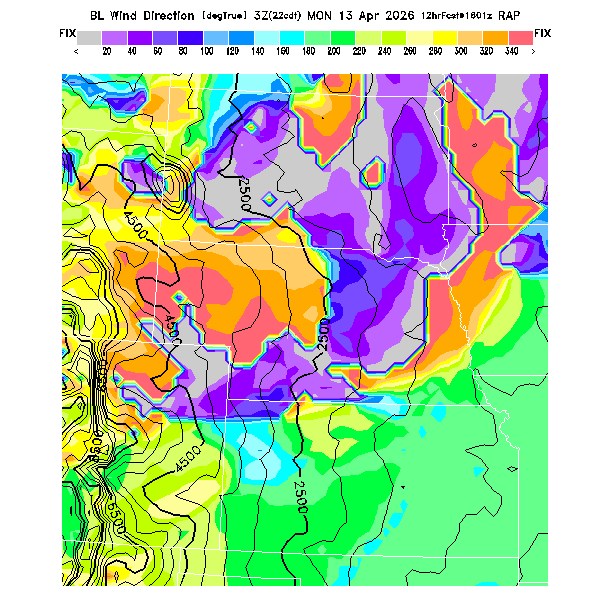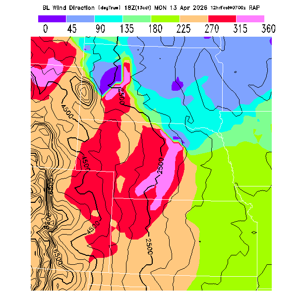 The direction of the vector-averaged wind in the BL.  This prediction can be misleading if there is a large change in wind direction through the BL (for a complex wind profile, any single number is not an adequate descriptor!).  Note that there will be a abrupt artificial gradient at the "cross-over" between 0 and 360 degrees.  MoreInfo