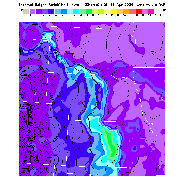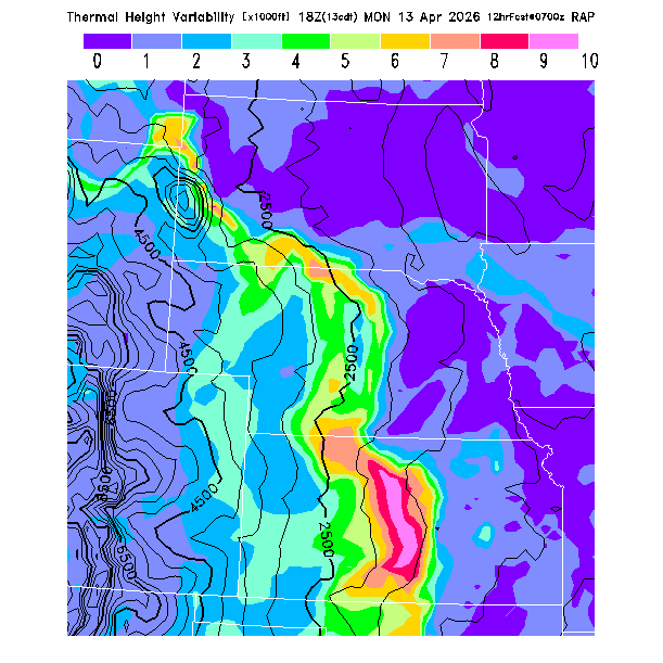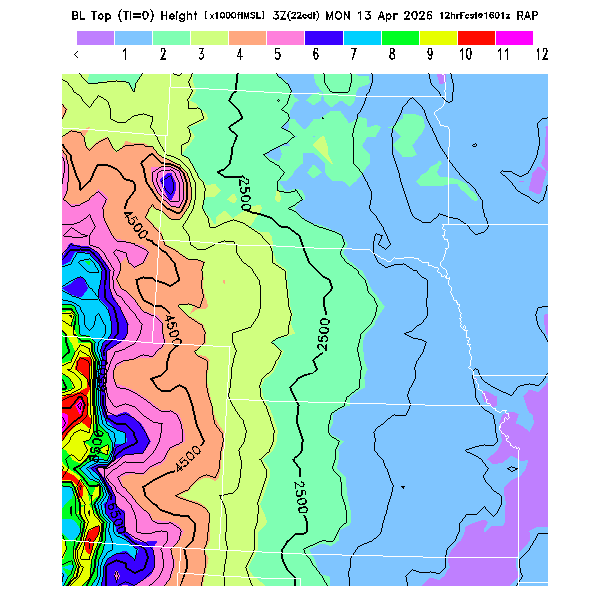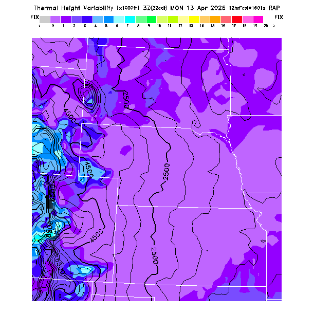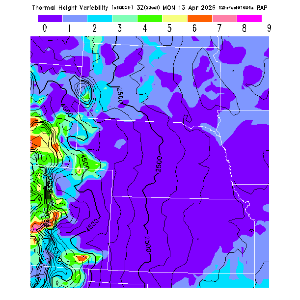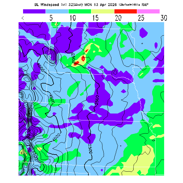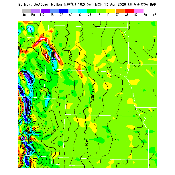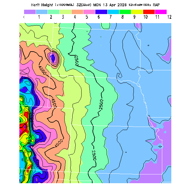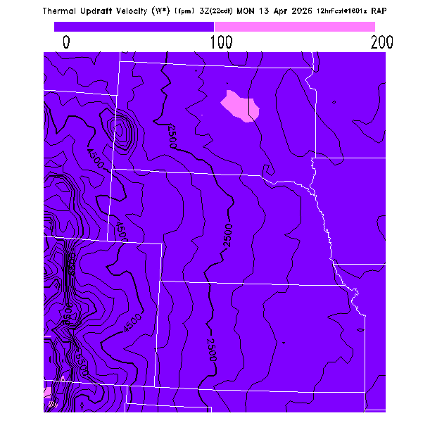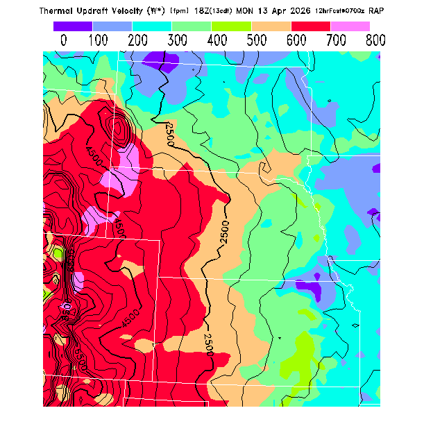 State outlines are depicted on each BLIPMAP in white.  The RAP topography is plotted as black contours, at 500 ft intervals with thicker lines at 2000 ft intervals, to assist in location identification but also to emphasize the smoothed nature of the model topography.  The BLIPMAP does not predict thermal lift created by small-scale terrain features which are not resolved by the model topography, which often give localized updrafts significantly stronger than those over the surrounding smoother terrain.  Maps of location identifiers and additional topography information for this region are available at the GP Grid Orientation webpage.