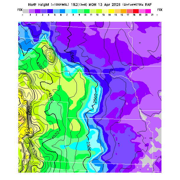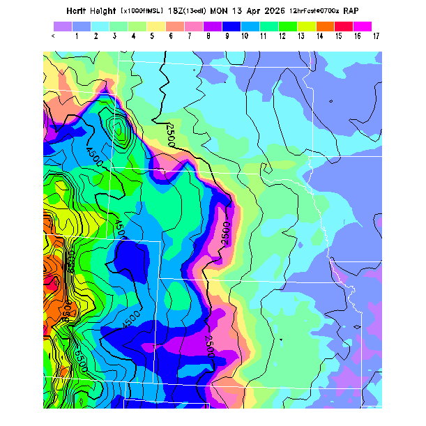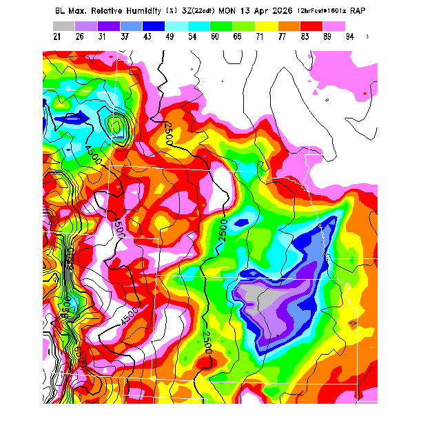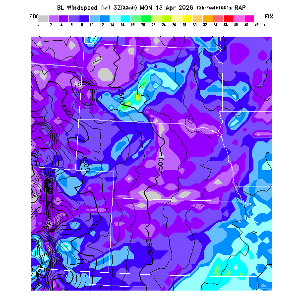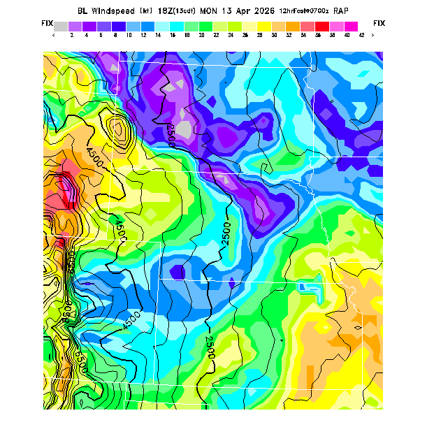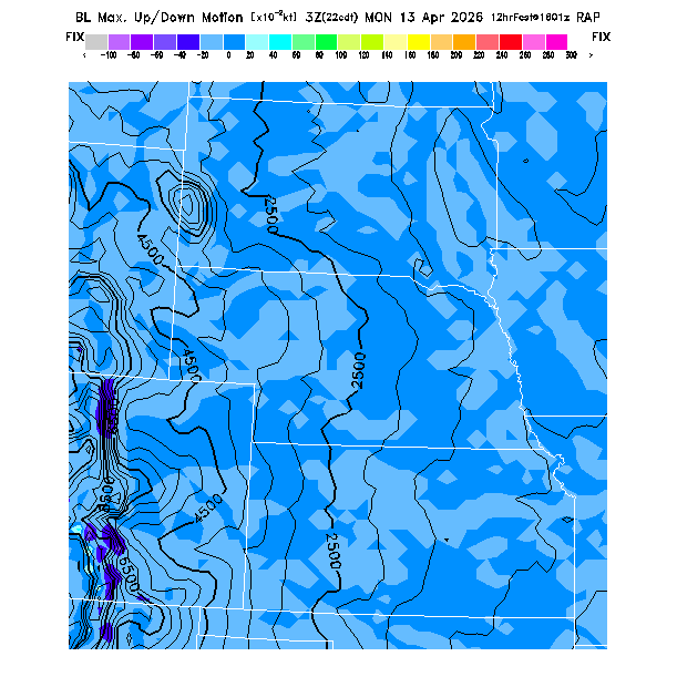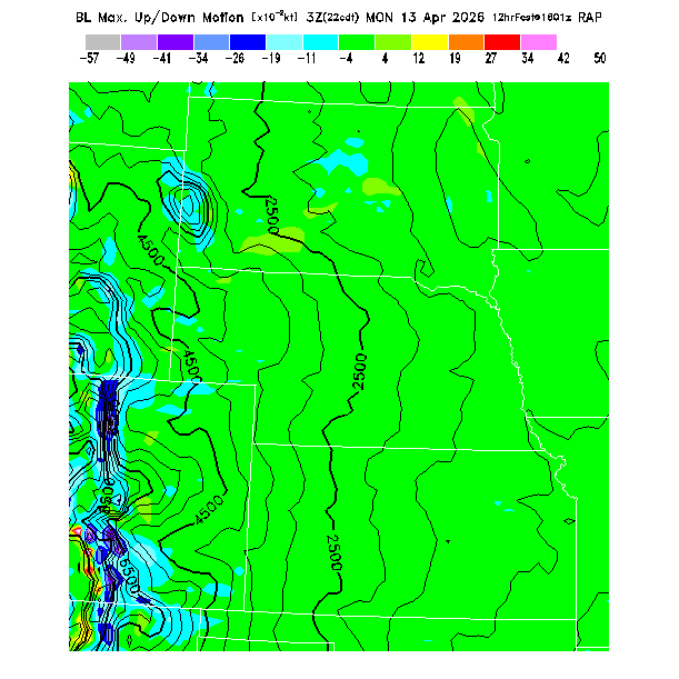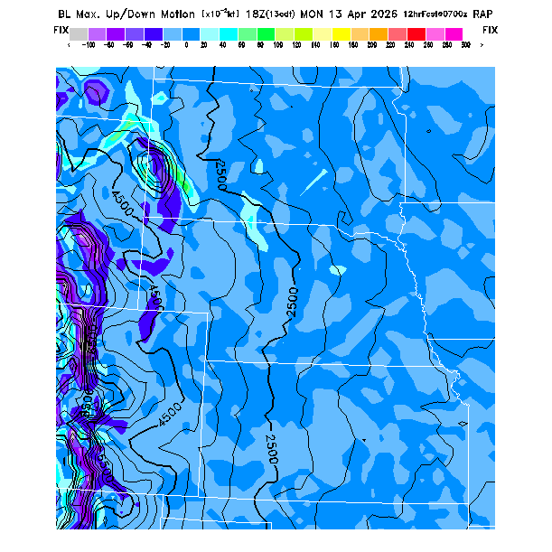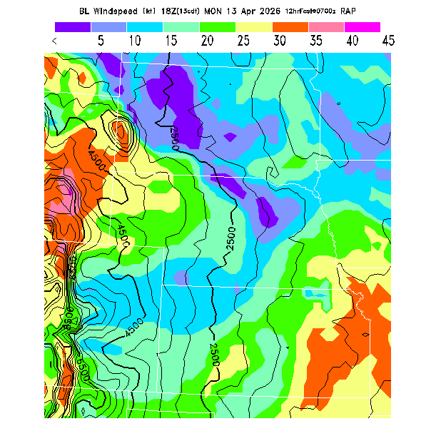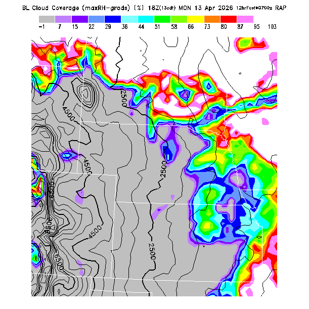 State outlines are depicted on each BLIPMAP in white.  The RAP topography is plotted as black contours, at 500 ft intervals with thicker lines at 2000 ft intervals, to assist in location identification but also to emphasize the smoothed nature of the model topography.  The BLIPMAP does not predict thermal lift created by small-scale terrain features which are not resolved by the model topography, which often give localized updrafts significantly stronger than those over the surrounding smoother terrain.  Maps of location identifiers and additional topography information for this region are available at the GP Grid Orientation webpage.