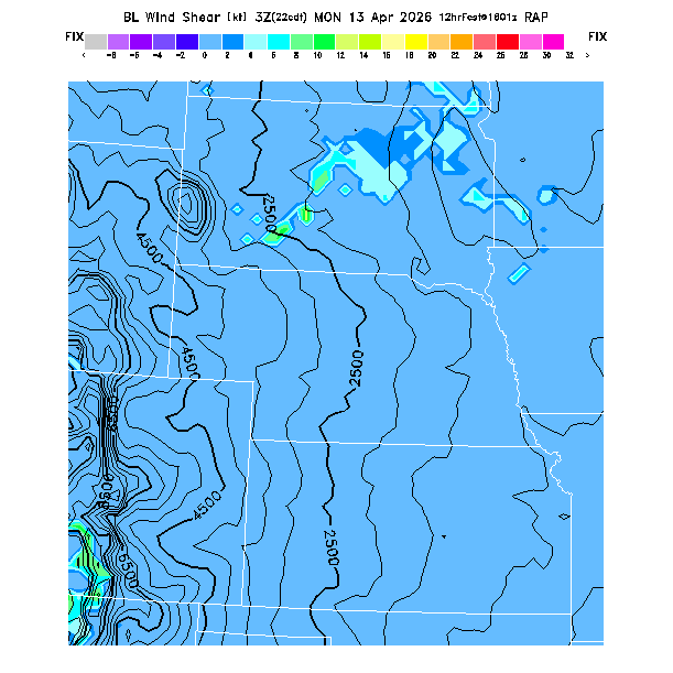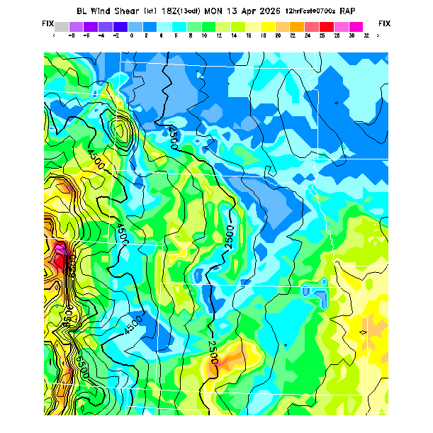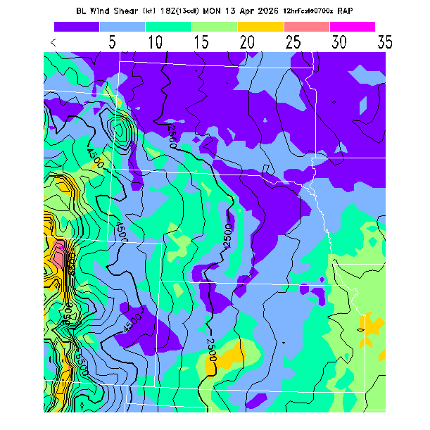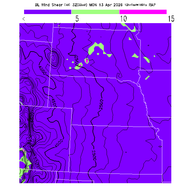 The magnitude of the vector wind difference between the top and bottom of the BL.  Note that this represents vertical wind shear and does not indicate "shear lines" (which are horizontal changes of wind speed/direction).  MoreInfo