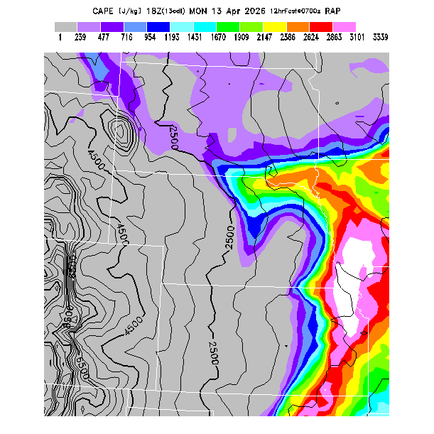Convective Available Potential Energy indicates the atmospheric stability affecting deep convective cloud formation above the BL.  A higher value indicates greater potential instability, larger updraft velocities within deep convective clouds, and greater potential for thunderstorm development (since a trigger is needed to release that potential).  Note that thunderstorms may develop in regions of high CAPE and then get transported downwind to regions of lower CAPE.  Also, locations where both convergence and CAPE values are high can be subject to explosive thunderstorm development.   MoreInfo