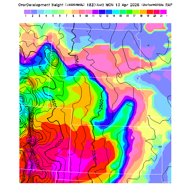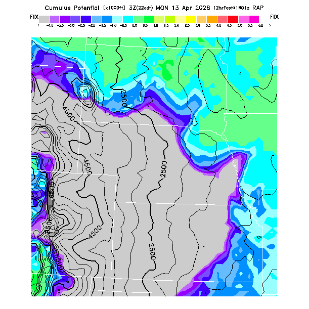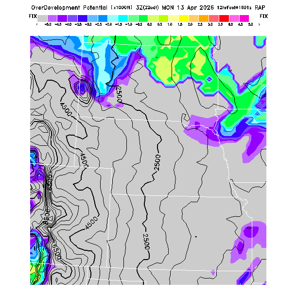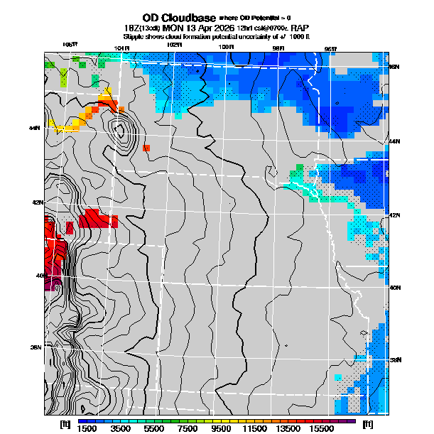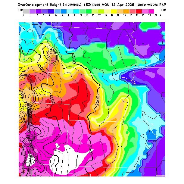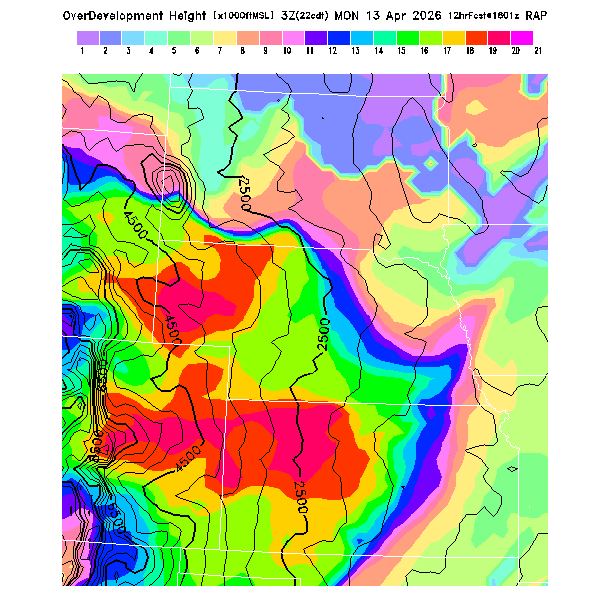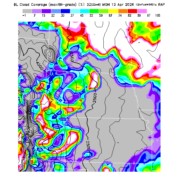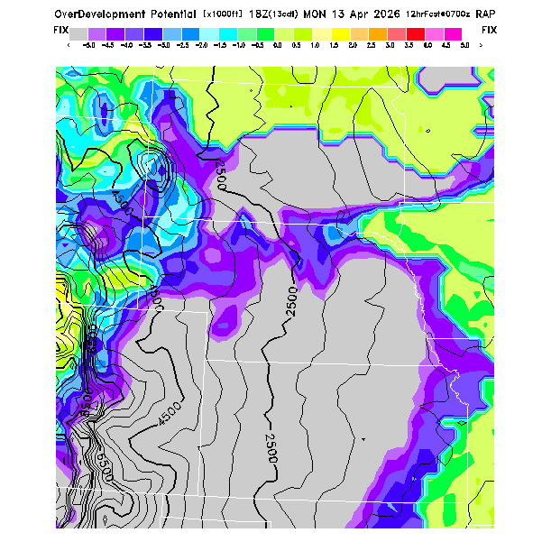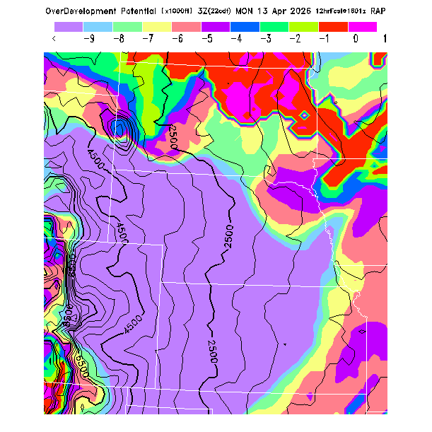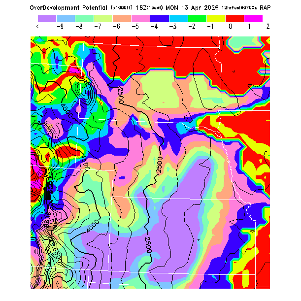 This evaluates the potential for extensive cloud formation (OvercastDevelopment) at the BL top, being the height difference between the BL CL (see below) and the BL top.  Extensive clouds and likely OvercastDevelopment are predicted when the parameter is positive, with OvercastDevelopment being increasingly more likely with higher positive values.  OvercastDevelopment can also occur with negative values if the air is lifted up the indicated vertical distance by flow up a small-scale ridge not resolved by the model's smoothed topography.  [This parameter is truncated at -10,000 for plotting.]   MoreInfo