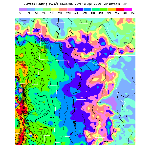 BLIPMAPs predict thermal soaring conditions resulting from surface heating of the Boundary Layer (BL), the scientific term for the turbulent atmospheric region mixed by surface-based thermals (so thermal tops occur at the top of the BL).  The BLIPMAP program post-processes numerical weather model predictions to provide parameters suited to the needs of soaring pilots and presents them in graphical format, as in this sample BLIPMAP.  Relative differences, both in location and in time, are expected to be more reliable indicators of soaring differences than are the precise numerical values.  BASIC thermal forecast parameters gives a short list of the parameters most important for thermal soaring.