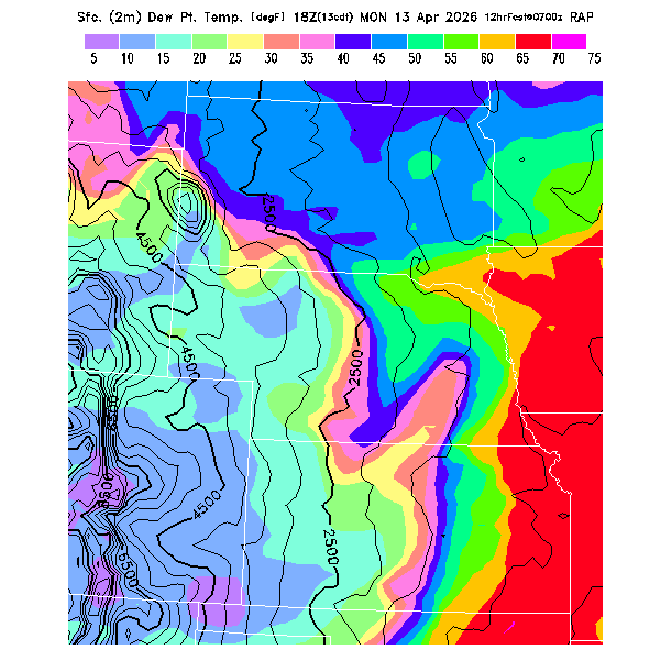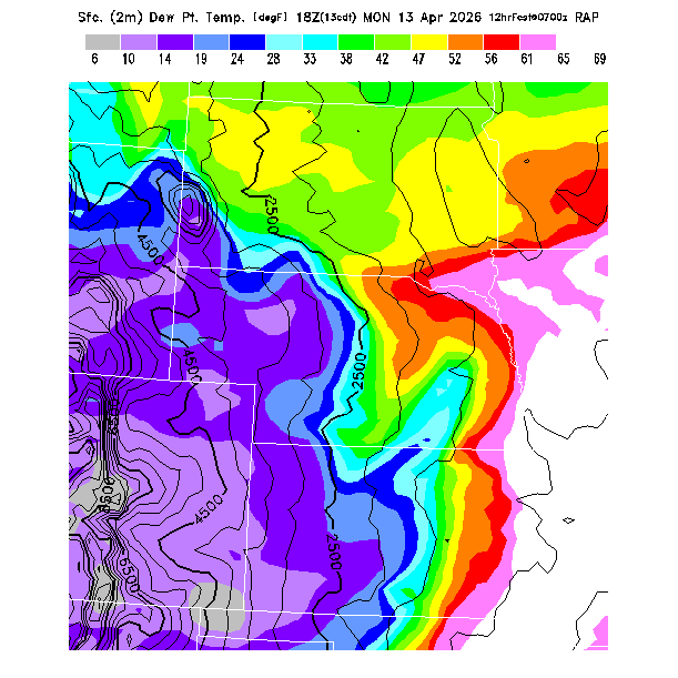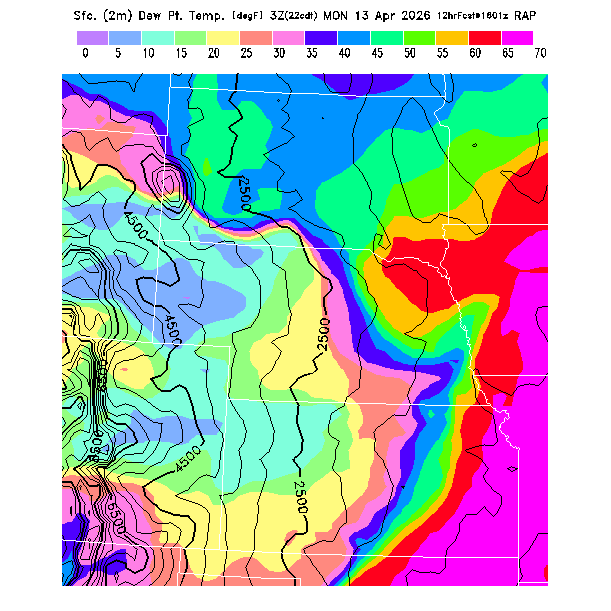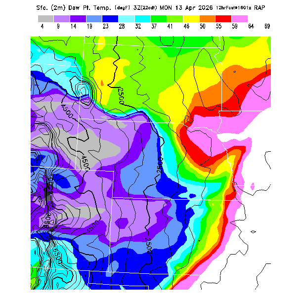 This model-predicted surface dew point temperature can be compared to the actual dew point temperature at 2m during the day to evaluate the accuracy of model moisture predictions.  MoreInfo