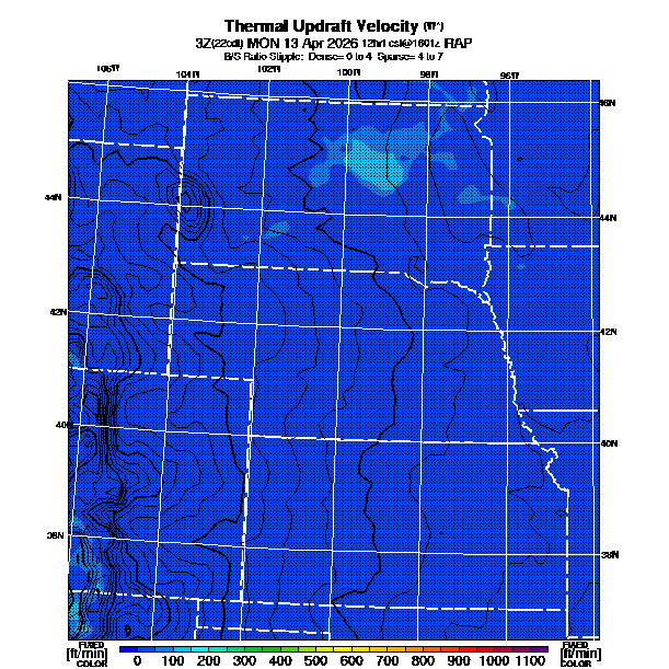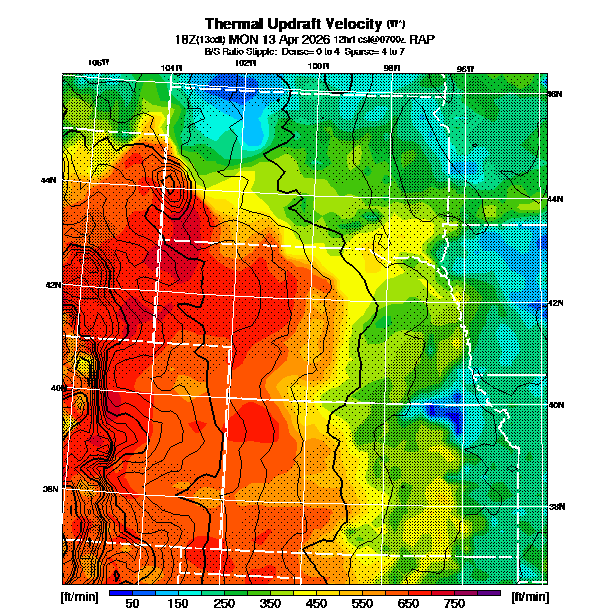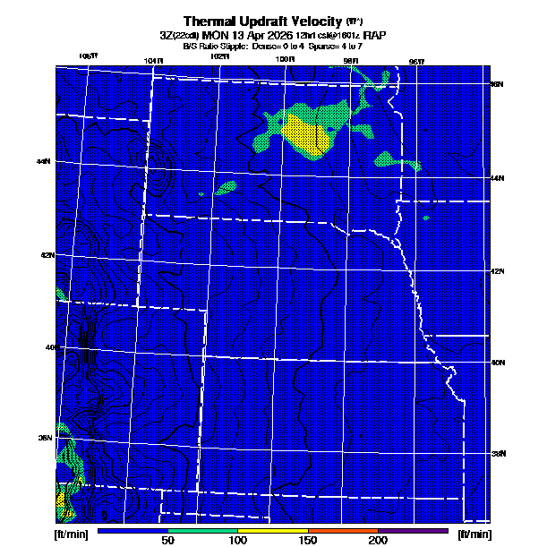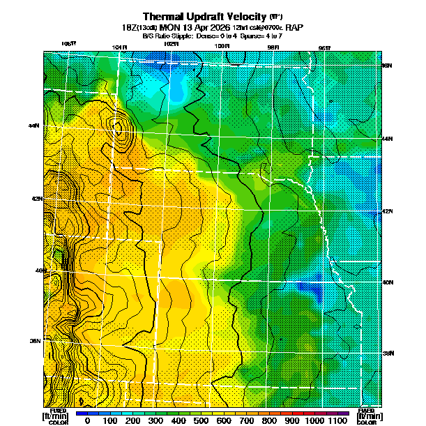 B/S Ratio stippling (dense=0-4 sparse=4-7) overlays Thermal Updraft Velocity contours to indicate where strong thermals can be broken by vertical wind shear.  See "Thermal Updraft Velocity" and "Buoyancy/Shear Ratio" parameter descriptions below for more information.