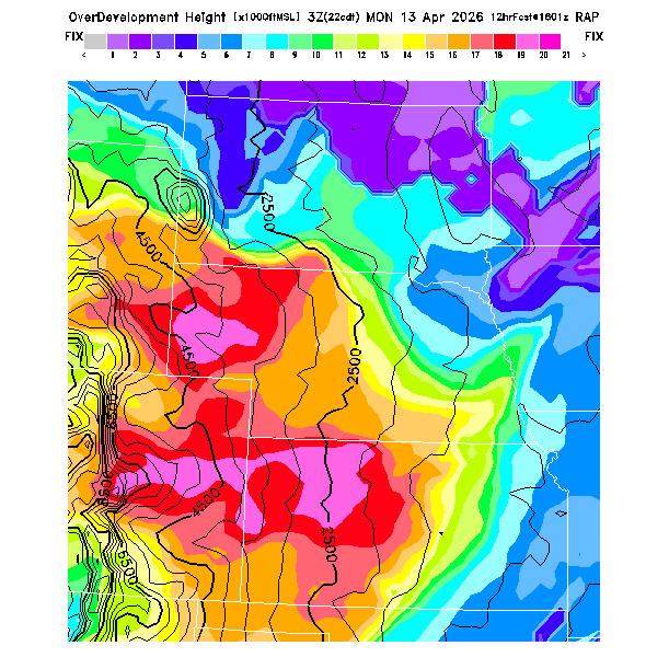 Height of the average dry thermal tops, or Thermal Index TI=0 height.  Over flat terrain maximum thermalling heights will be lower due to the glider descent rate and other factors.  However, thermal tops will be higher over small-scale topography not resolved by the model and some pilots have reported that in elevated terrain the heights they can reach over local terrain features correspond better with the TI=0 height than with Hcrit.  In the presence of clouds the thermal top will increase, but the maximum thermalling height will then be limited by the cloud base (see the "Cloud prediction parameters" section below).  [This parameter is truncated at 22,000 for plotting.]   MoreInfo