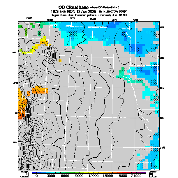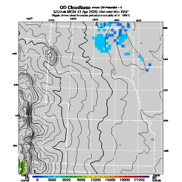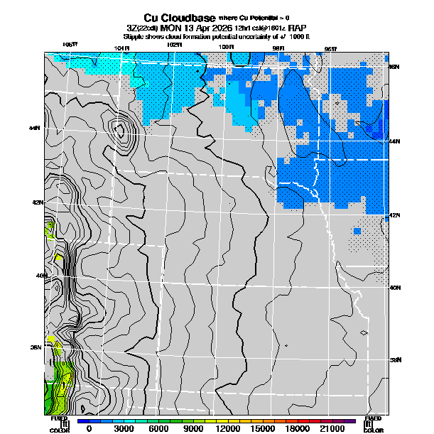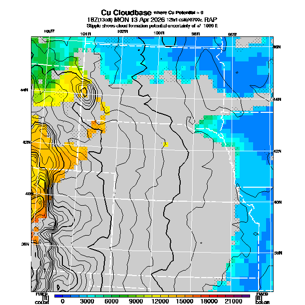 This parameter estimates the height at which the average dry updraft strength drops below 225 fpm and over flat terrain is expected to give better quantitative numbers for the maximum cloudless thermalling height than is the traditional TI=0 height given above, although the qualitative patterns should be similar for both parameters.  (Note: the present assumptions tend to underpredict the max. thermalling height.) In the presence of clouds the maximum thermalling height may instead be limited by the cloud base (see the "Cloud prediction parameters" section below).  [This parameter is truncated at 22,000 for plotting.]   MoreInfo