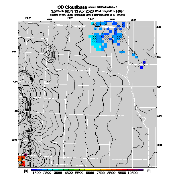 A sequence of forecasts, all for the same validation time of Multi-Time, is produced during the day as new observational data becomes available, each updated forecast having a shorter forecast period between the latest observation and validation times.  [Model initialization (observation analysis) time + Forecast Period = Validation (forecast) time]  The most important link is the first link on each line, "Latest", which gives the most recent (shortest period) forecast. The following "FirstToday" link gives the first forecast from the current day, which can be used to determine whether the model is significantly altering its predictions during the updating.  The last link, "PreviousDay", gives the last forecast from the previous day's prediction sequence, useful for those who want to compare their experiences from yesterday's flight to the RAP BLIPMAP predictions.  At the top of each forecast plot is the name of the parameter, the validation date and time, the forecast period, and the data source.