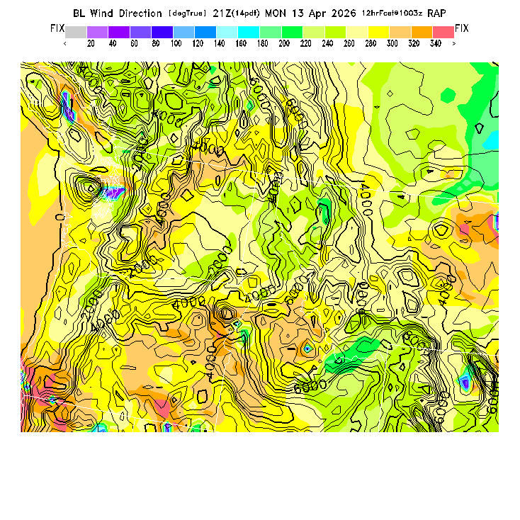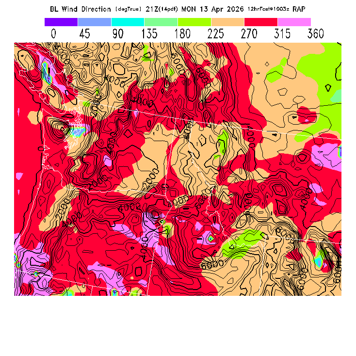The direction of the vector-averaged wind in the BL.  This prediction can be misleading if there is a large change in wind direction through the BL (for a complex wind profile, any single number is not an adequate descriptor!).  Note that there will be a abrupt artificial gradient at the "cross-over" between 0 and 360 degrees.  MoreInfo