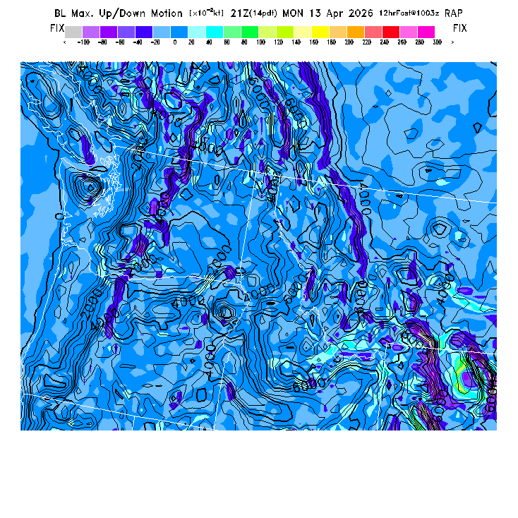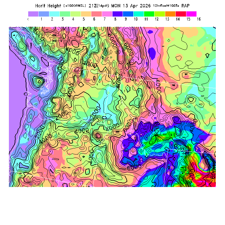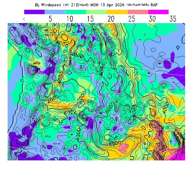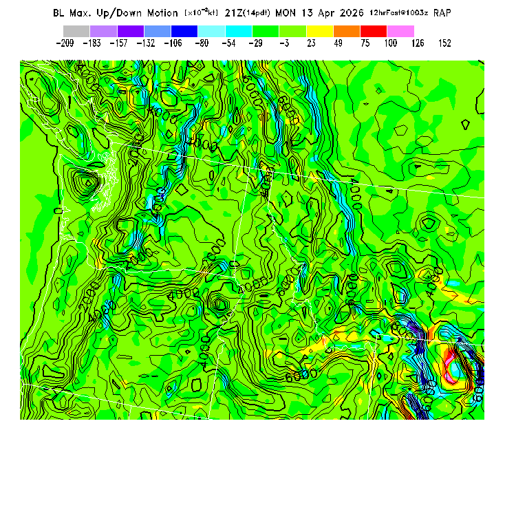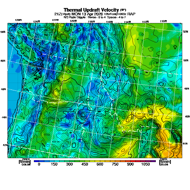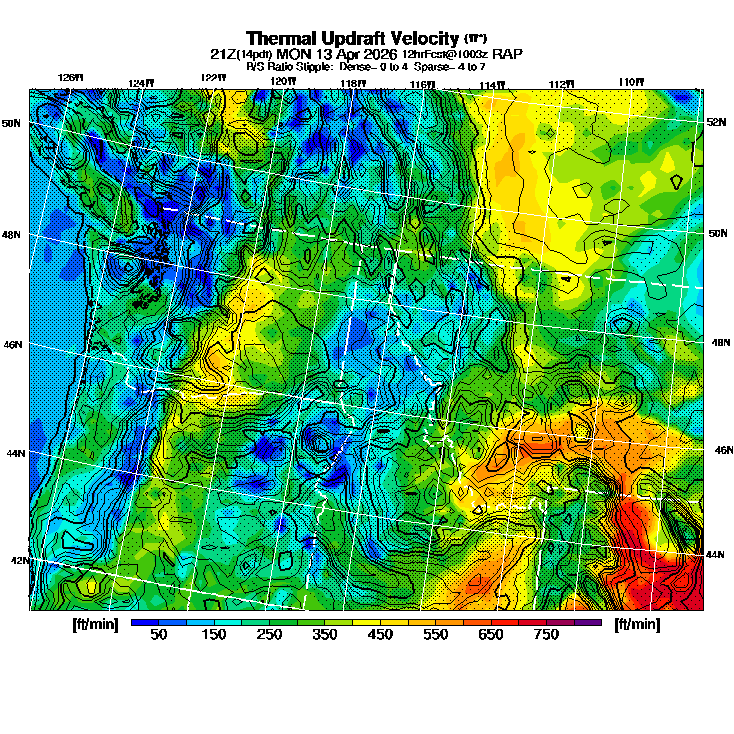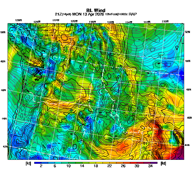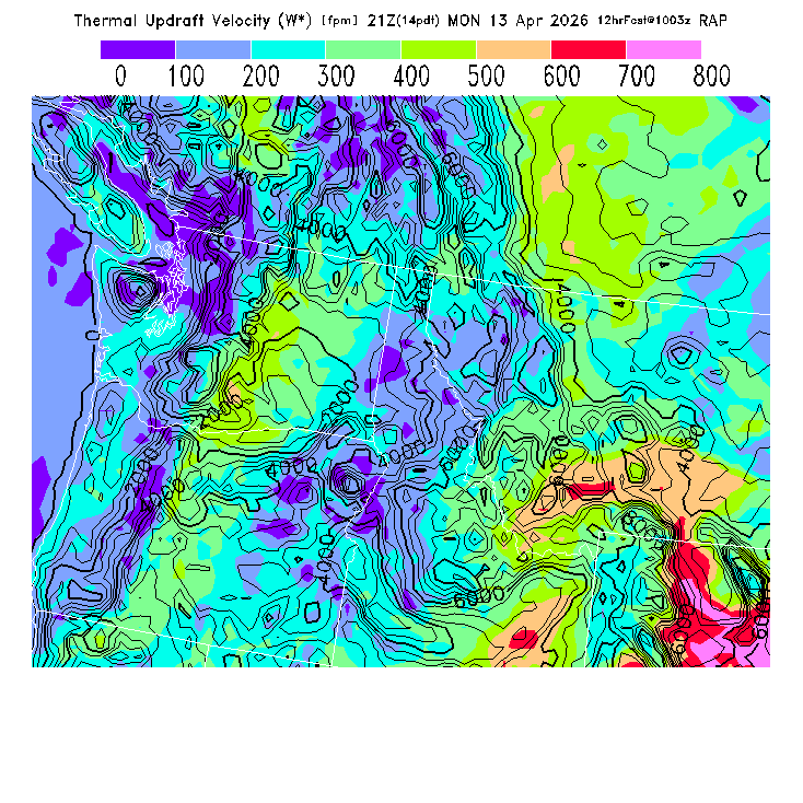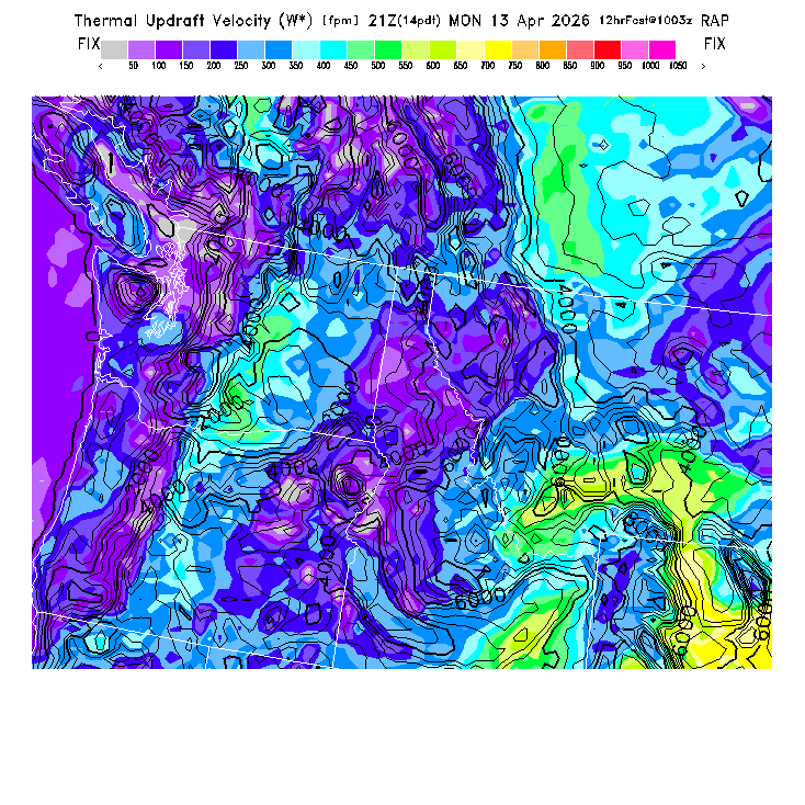 State outlines are depicted on each BLIPMAP in white.  The RAP topography is plotted as black contours, at 500 ft intervals with thicker lines at 2000 ft intervals, to assist in location identification but also to emphasize the smoothed nature of the model topography.  The BLIPMAP does not predict thermal lift created by small-scale terrain features which are not resolved by the model topography, which often give localized updrafts significantly stronger than those over the surrounding smoother terrain.  Maps of location identifiers and additional topography information for this region are available at the NW Grid Orientation webpage.