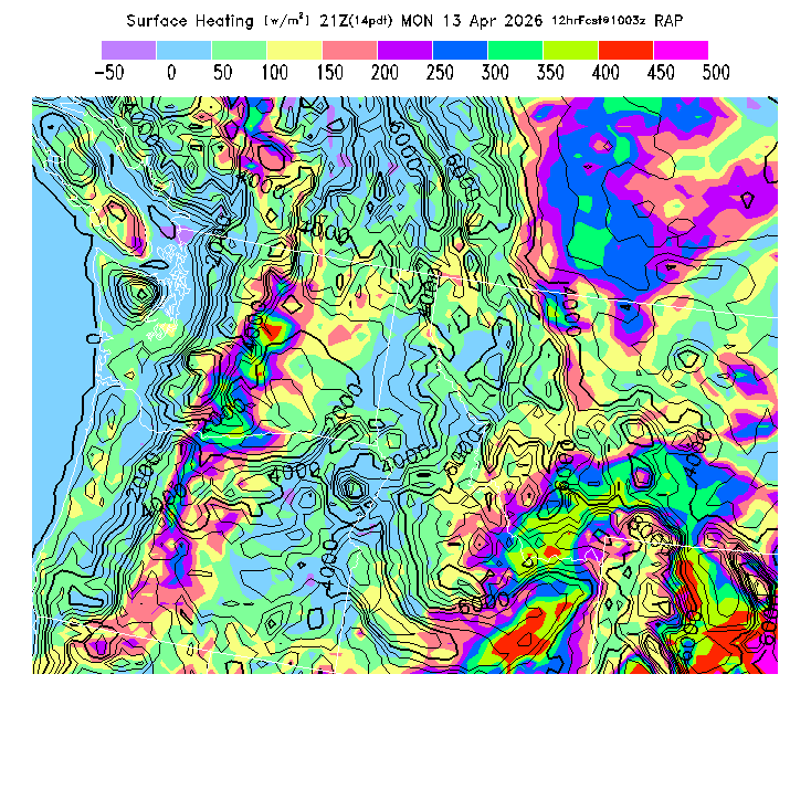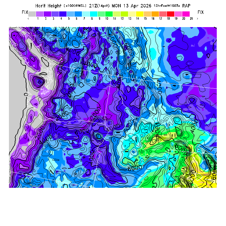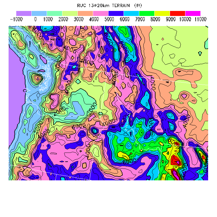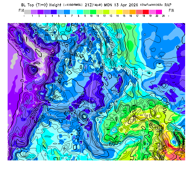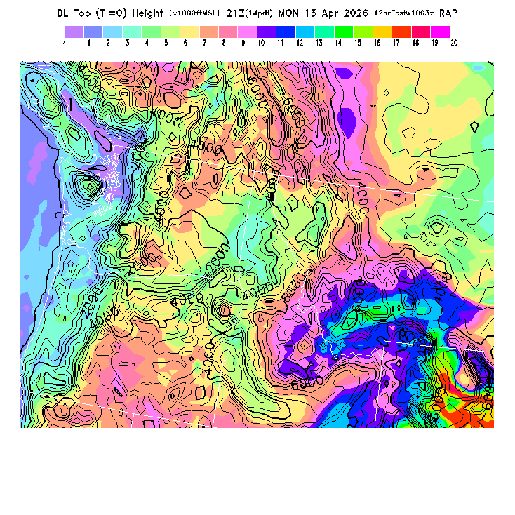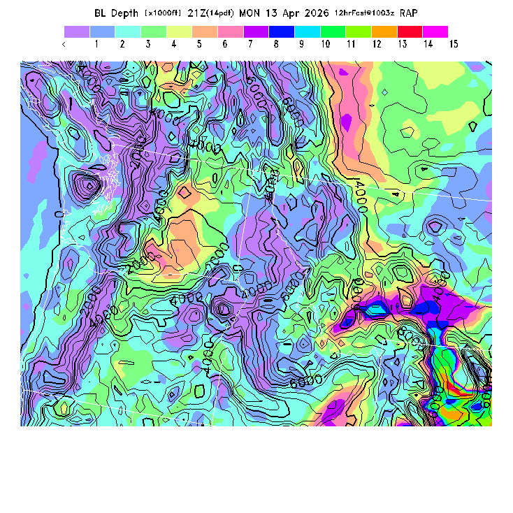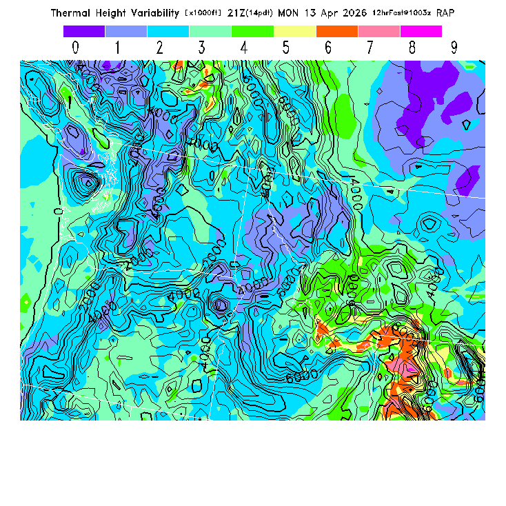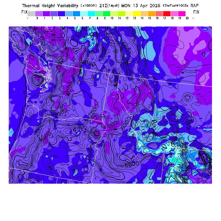 State outlines are depicted on each BLIPMAP in white.  The RAP topography is plotted as black contours, at 500 ft intervals with thicker lines at 2000 ft intervals, to assist in location identification but also to emphasize the smoothed nature of the model topography.  The BLIPMAP does not predict thermal lift created by small-scale terrain features which are not resolved by the model topography, which often give localized updrafts significantly stronger than those over the surrounding smoother terrain.  Maps of location identifiers and additional topography information for this region are available at the NW Grid Orientation webpage.