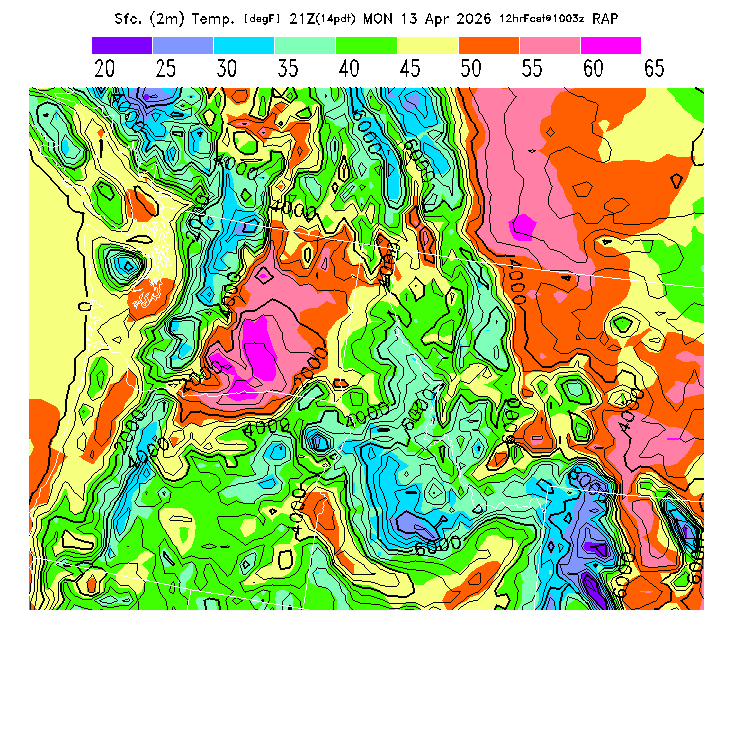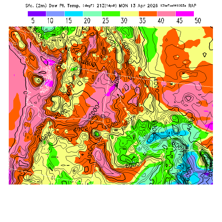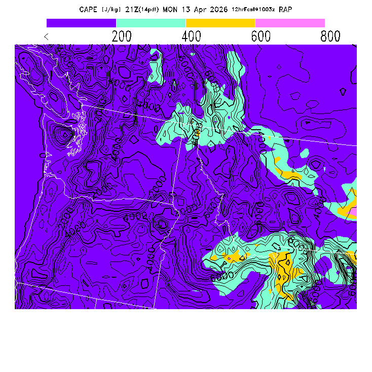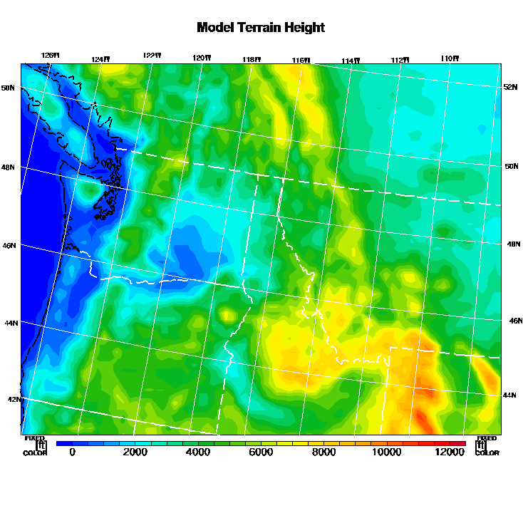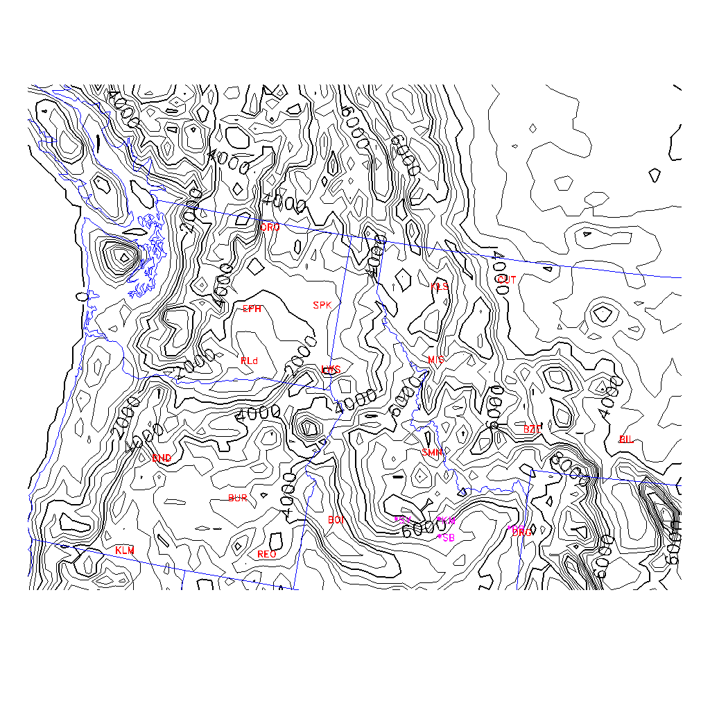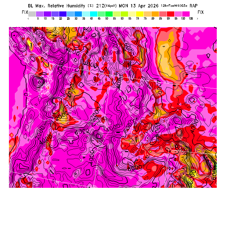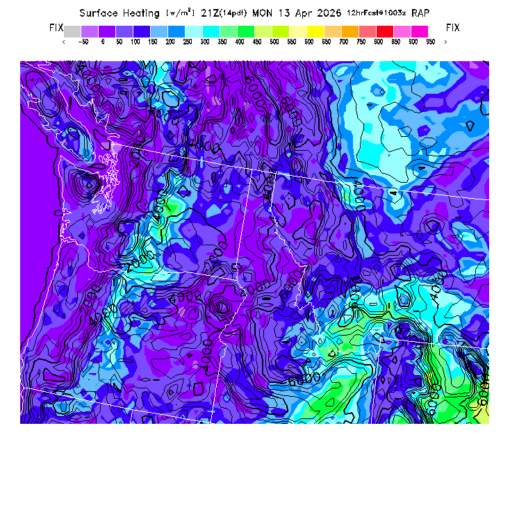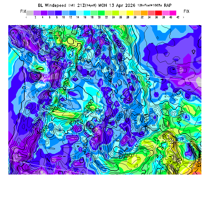 State outlines are depicted on each BLIPMAP in white.  The RAP topography is plotted as black contours, at 500 ft intervals with thicker lines at 2000 ft intervals, to assist in location identification but also to emphasize the smoothed nature of the model topography.  The BLIPMAP does not predict thermal lift created by small-scale terrain features which are not resolved by the model topography, which often give localized updrafts significantly stronger than those over the surrounding smoother terrain.  Maps of location identifiers and additional topography information for this region are available at the NW Grid Orientation webpage.