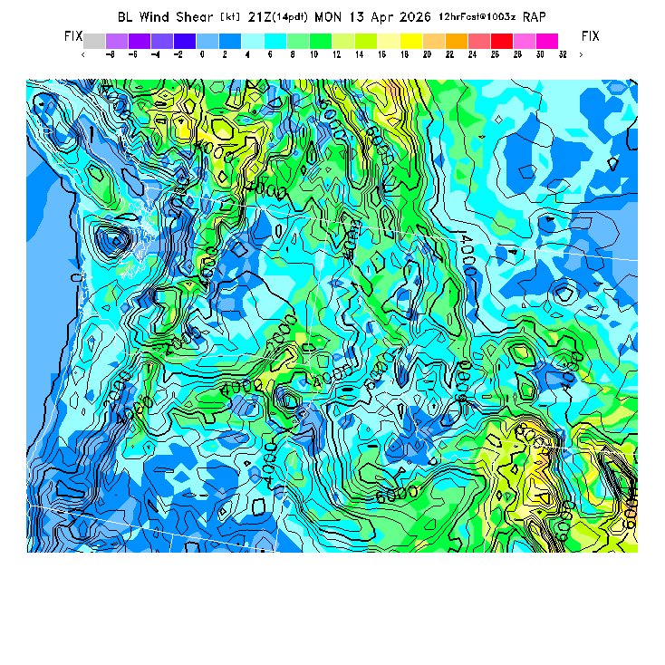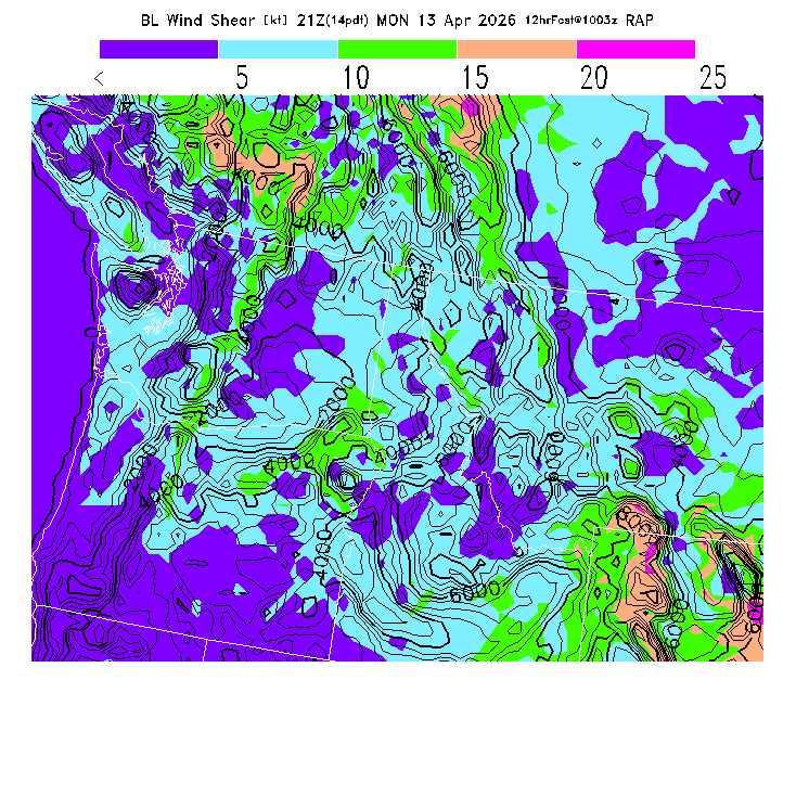 The magnitude of the vector wind difference between the top and bottom of the BL.  Note that this represents vertical wind shear and does not indicate "shear lines" (which are horizontal changes of wind speed/direction).  MoreInfo