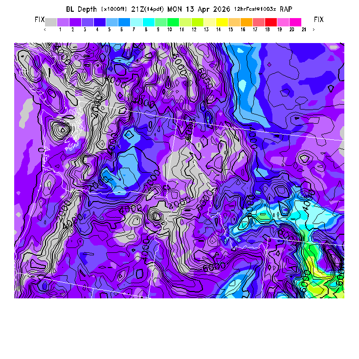 BLIPMAPs predict thermal soaring conditions resulting from surface heating of the Boundary Layer (BL), the scientific term for the turbulent atmospheric region mixed by surface-based thermals (so thermal tops occur at the top of the BL).  The BLIPMAP program post-processes numerical weather model predictions to provide parameters suited to the needs of soaring pilots and presents them in graphical format, as in this sample BLIPMAP.  Relative differences, both in location and in time, are expected to be more reliable indicators of soaring differences than are the precise numerical values.  BASIC thermal forecast parameters gives a short list of the parameters most important for thermal soaring.