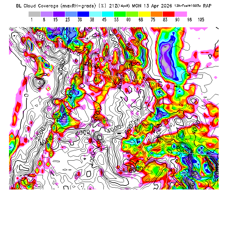 This parameter provides an additional means of evaluating the formation of clouds within the BL and might be used either in conjunction with or instead of the other cloud prediction parameters.  Larger values indicate greater cloud probability, but use of this parameter must be empirical since no theoretical guidance is available - for example, pilots must determine by actual experience the percentage that correlates with formation of clouds above local mountains.  The cloud base height is not predicted, but is expected to be below the TI=0 height.  MoreInfo