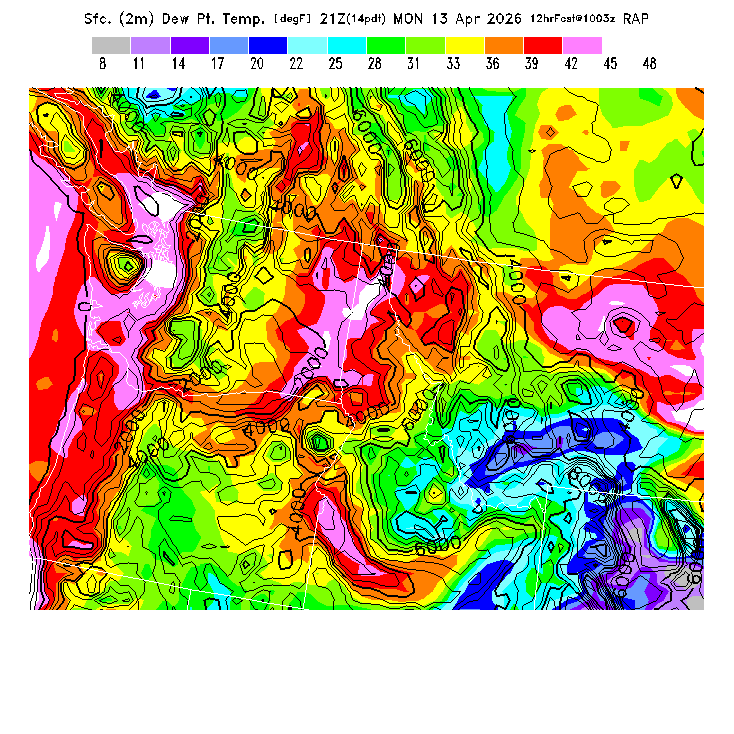 This model-predicted surface dew point temperature can be compared to the actual dew point temperature at 2m during the day to evaluate the accuracy of model moisture predictions.  MoreInfo