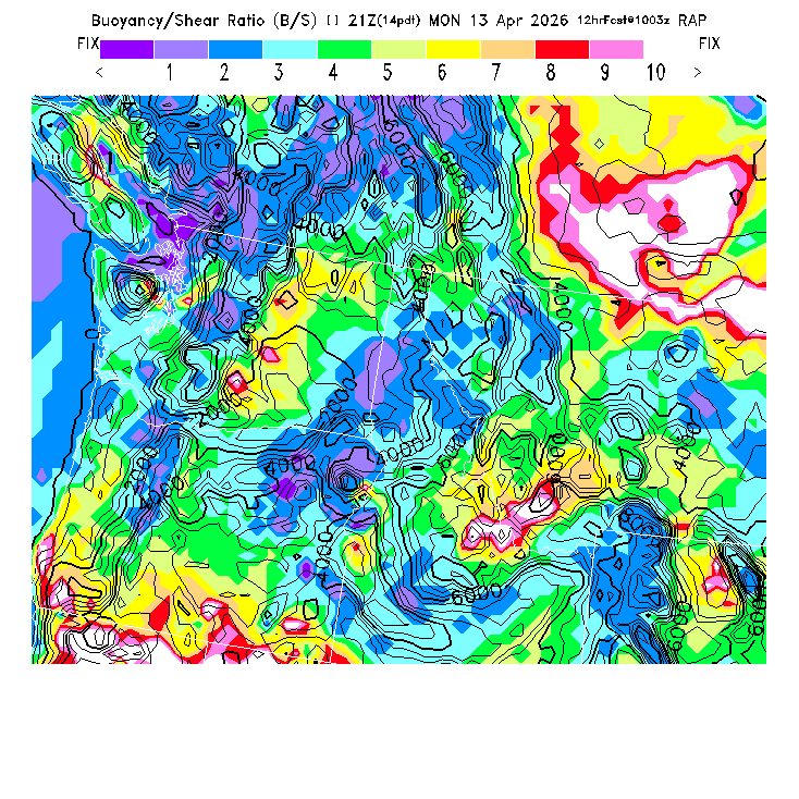 B/S Ratio stippling (dense=0-4 sparse=4-7) overlays Thermal Updraft Velocity contours to indicate where strong thermals can be broken by vertical wind shear.  See "Thermal Updraft Velocity" and "Buoyancy/Shear Ratio" parameter descriptions below for more information.