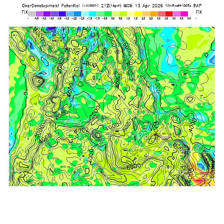 This evaluates the potential for extensive cloud formation (OvercastDevelopment) at the BL top, being the height difference between the BL CL (see below) and the BL top.  Extensive clouds and likely OvercastDevelopment are predicted when the parameter is positive, with OvercastDevelopment being increasingly more likely with higher positive values.  OvercastDevelopment can also occur with negative values if the air is lifted up the indicated vertical distance by flow up a small-scale ridge not resolved by the model's smoothed topography.  [This parameter is truncated at -10,000 for plotting.]   MoreInfo