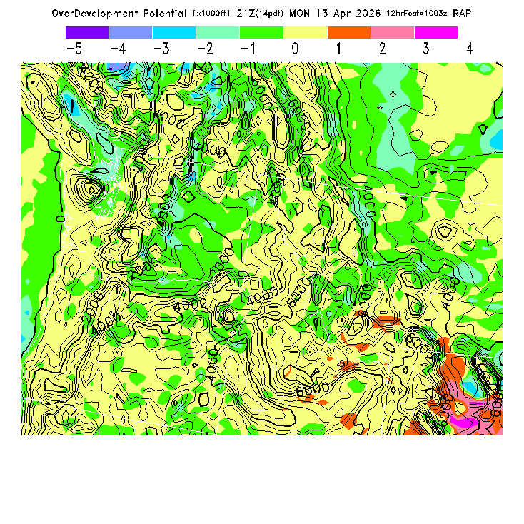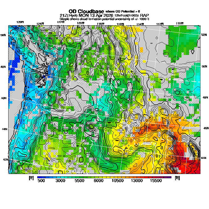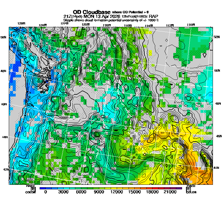 OvercastDevelopment Cloudbase Cloudbase contours are plotted only where that cloudbase is theoretically expected.  See "OvercastDevelopment Potential" and "OvercastDevelopment Cloudbase" parameter descriptions below for more information.  This composite is useful only for locations where the actual potential threshold for OD cloud production agrees with the theoretically-predicted value of zero.