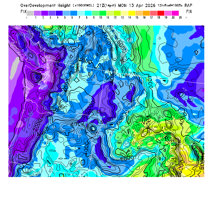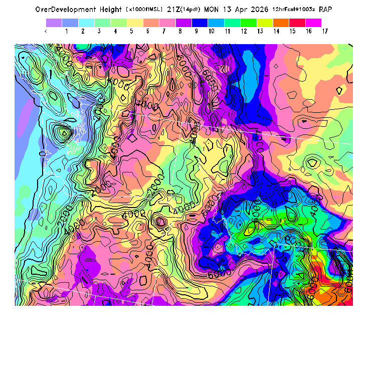 Height of the average dry thermal tops, or Thermal Index TI=0 height.  Over flat terrain maximum thermalling heights will be lower due to the glider descent rate and other factors.  However, thermal tops will be higher over small-scale topography not resolved by the model and some pilots have reported that in elevated terrain the heights they can reach over local terrain features correspond better with the TI=0 height than with Hcrit.  In the presence of clouds the thermal top will increase, but the maximum thermalling height will then be limited by the cloud base (see the "Cloud prediction parameters" section below).  [This parameter is truncated at 22,000 for plotting.]   MoreInfo