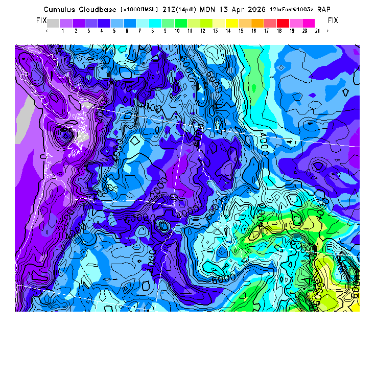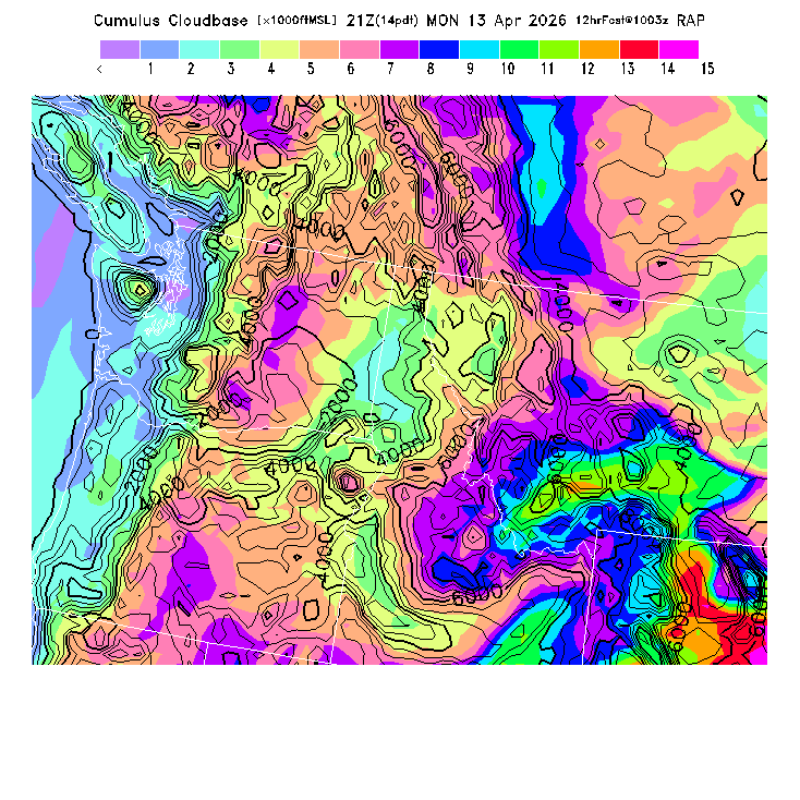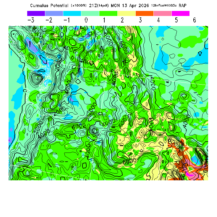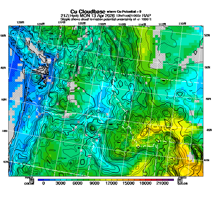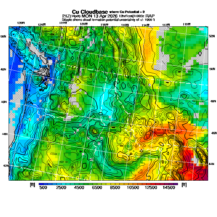 Cu Cloudbase Cloudbase contours are plotted only where that cloudbase is theoretically expected.  See "Cumulus Potential" and "Cumulus Cloudbase" parameter descriptions below for more information.  This composite is useful only for locations where the actual potential threshold for cumulus cloud production agrees with the theoretically-predicted value of zero.