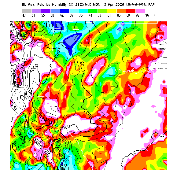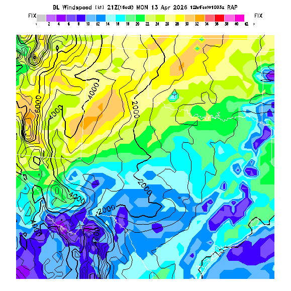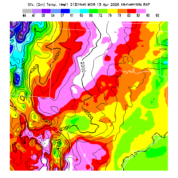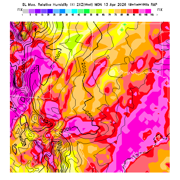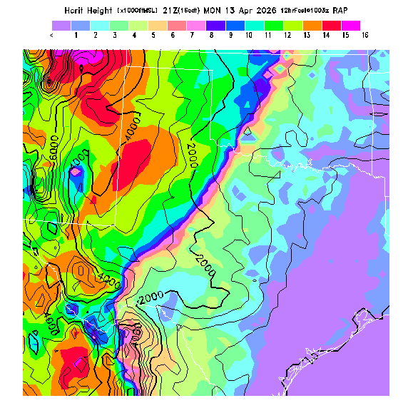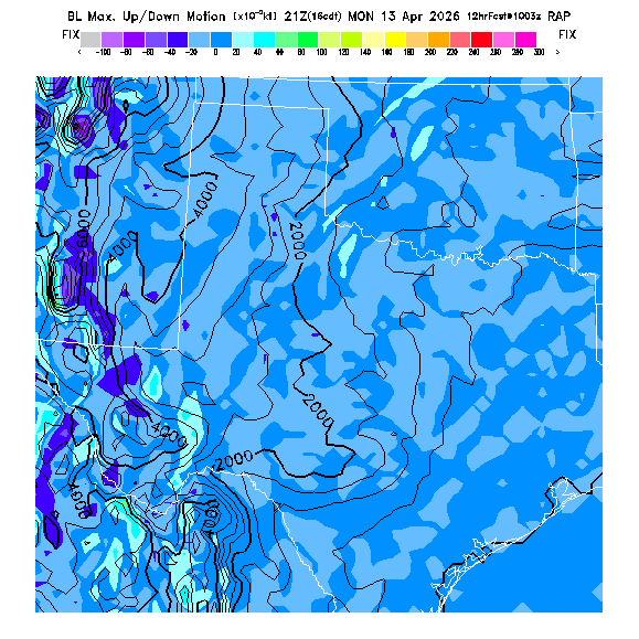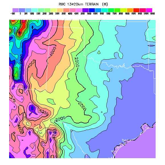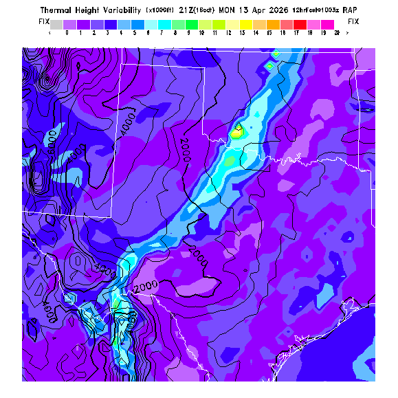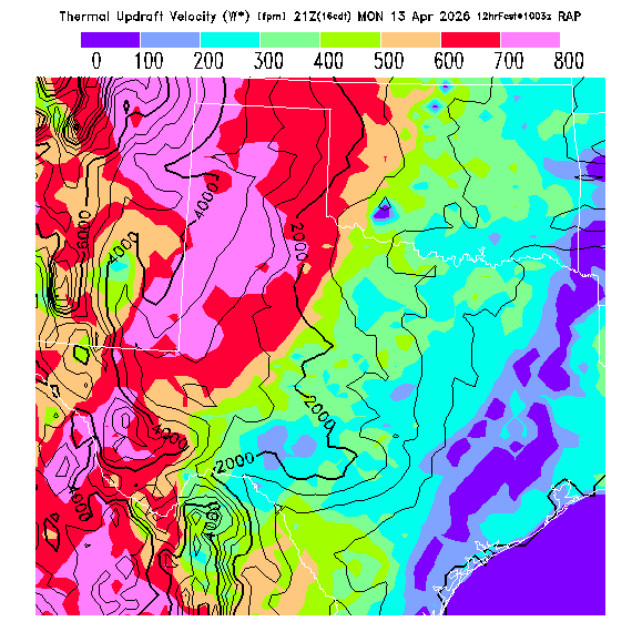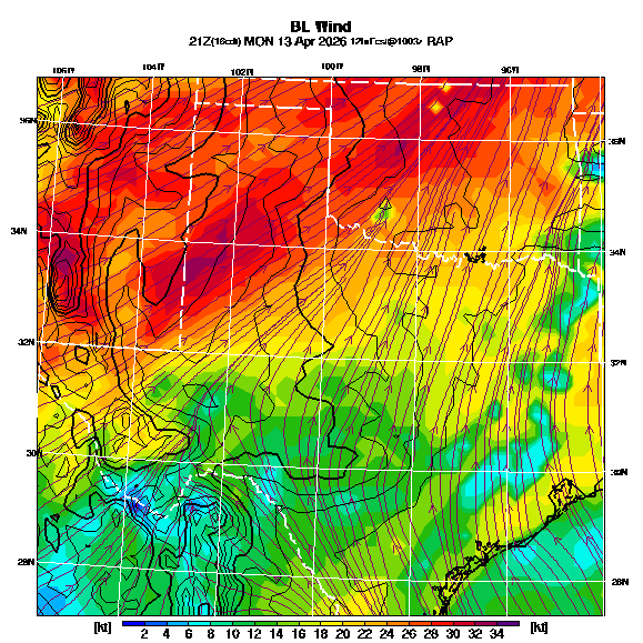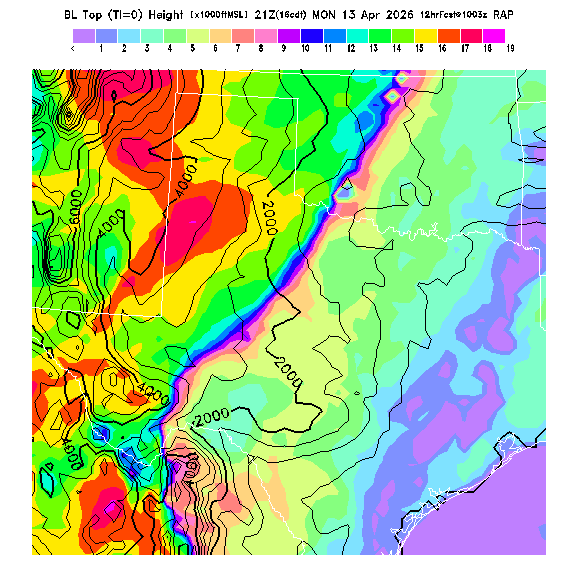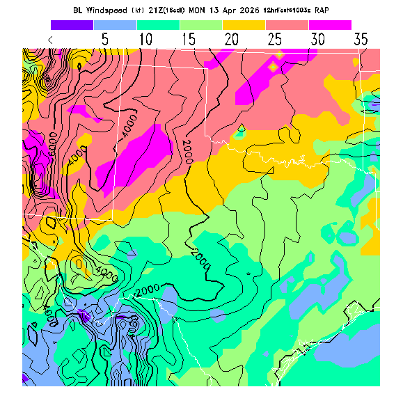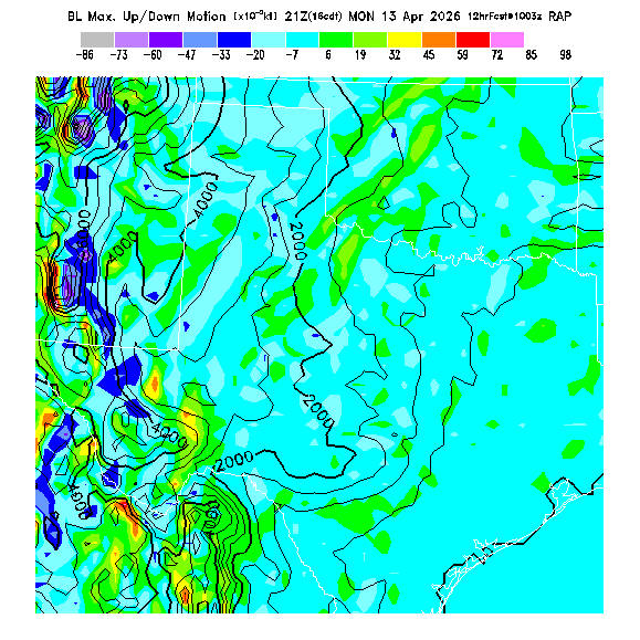 State outlines are depicted on each BLIPMAP in white.  The RAP topography is plotted as black contours, at 500 ft intervals with thicker lines at 2000 ft intervals, to assist in location identification but also to emphasize the smoothed nature of the model topography.  The BLIPMAP does not predict thermal lift created by small-scale terrain features which are not resolved by the model topography, which often give localized updrafts significantly stronger than those over the surrounding smoother terrain.  Maps of location identifiers and additional topography information for this region are available at the OKTX Grid Orientation webpage.