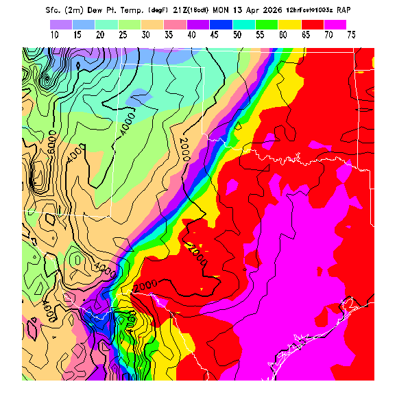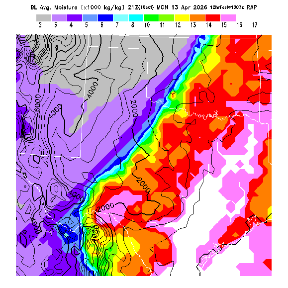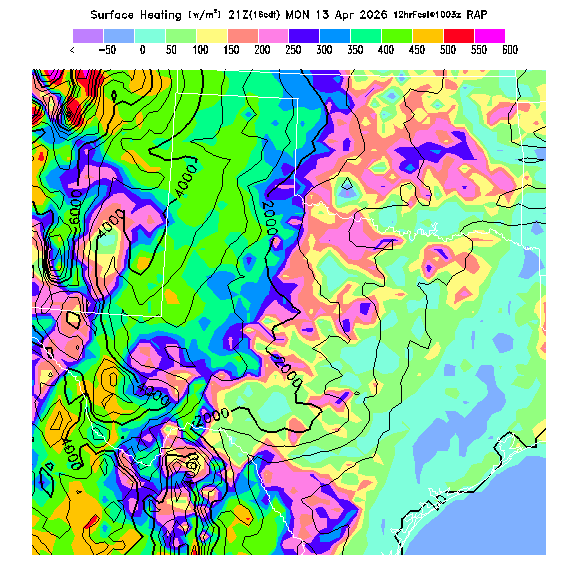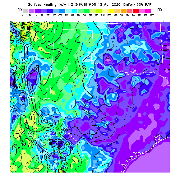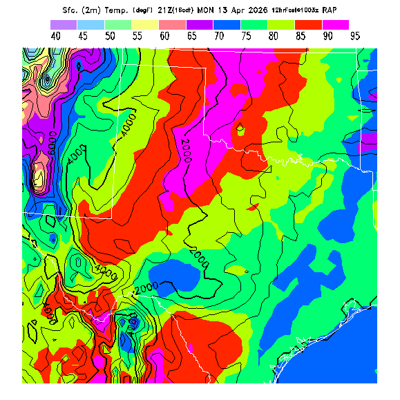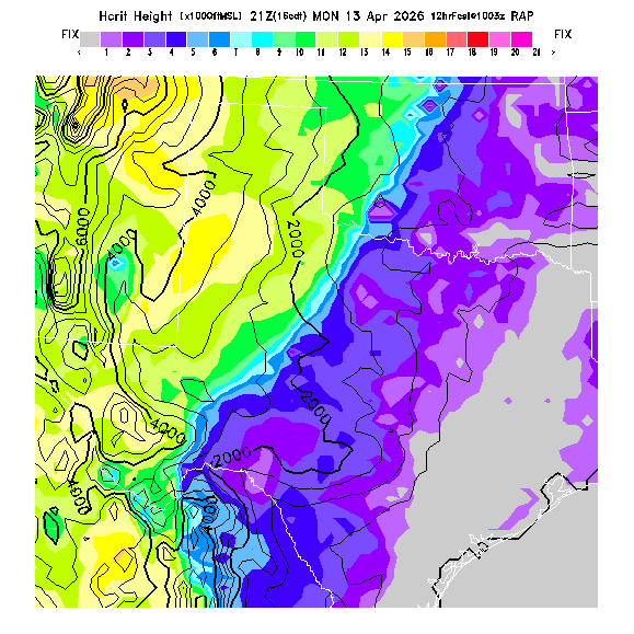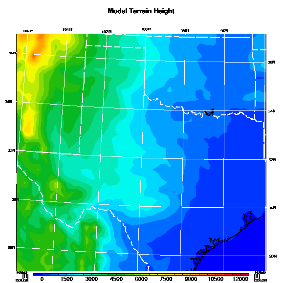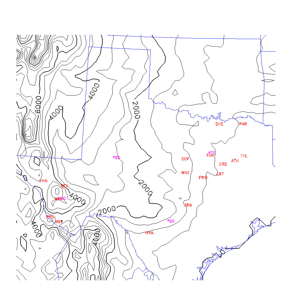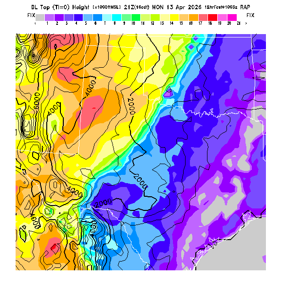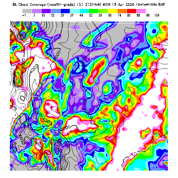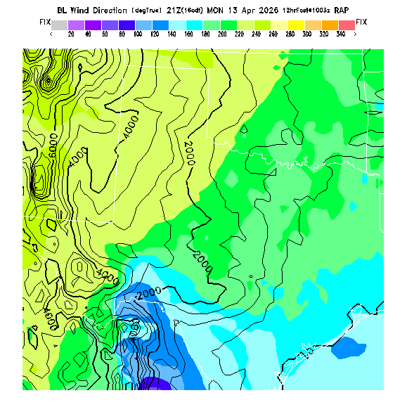 State outlines are depicted on each BLIPMAP in white.  The RAP topography is plotted as black contours, at 500 ft intervals with thicker lines at 2000 ft intervals, to assist in location identification but also to emphasize the smoothed nature of the model topography.  The BLIPMAP does not predict thermal lift created by small-scale terrain features which are not resolved by the model topography, which often give localized updrafts significantly stronger than those over the surrounding smoother terrain.  Maps of location identifiers and additional topography information for this region are available at the OKTX Grid Orientation webpage.