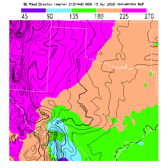The direction of the vector-averaged wind in the BL.  This prediction can be misleading if there is a large change in wind direction through the BL (for a complex wind profile, any single number is not an adequate descriptor!).  Note that there will be a abrupt artificial gradient at the "cross-over" between 0 and 360 degrees.  MoreInfo