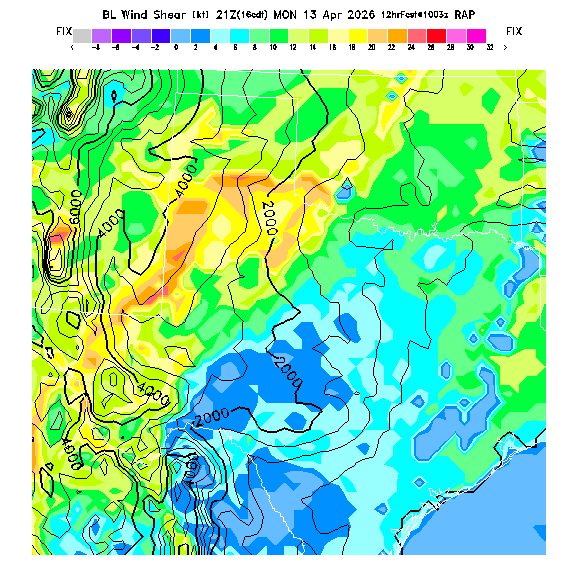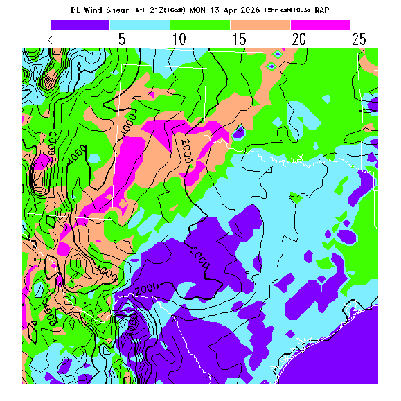 The magnitude of the vector wind difference between the top and bottom of the BL.  Note that this represents vertical wind shear and does not indicate "shear lines" (which are horizontal changes of wind speed/direction).  MoreInfo