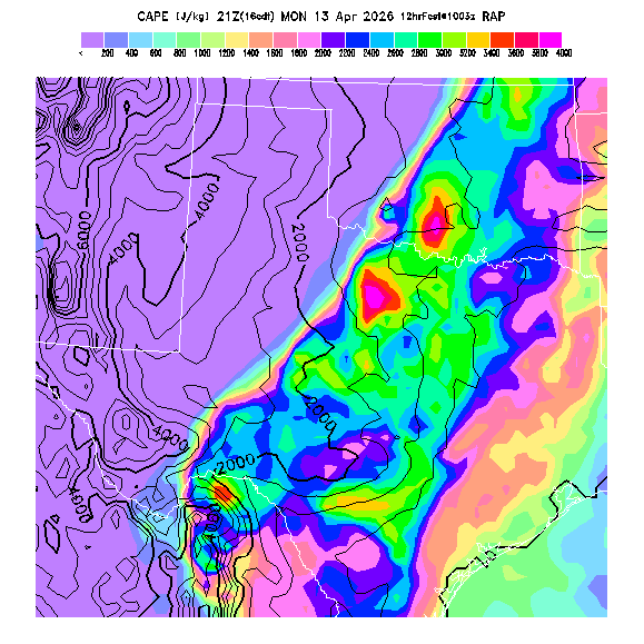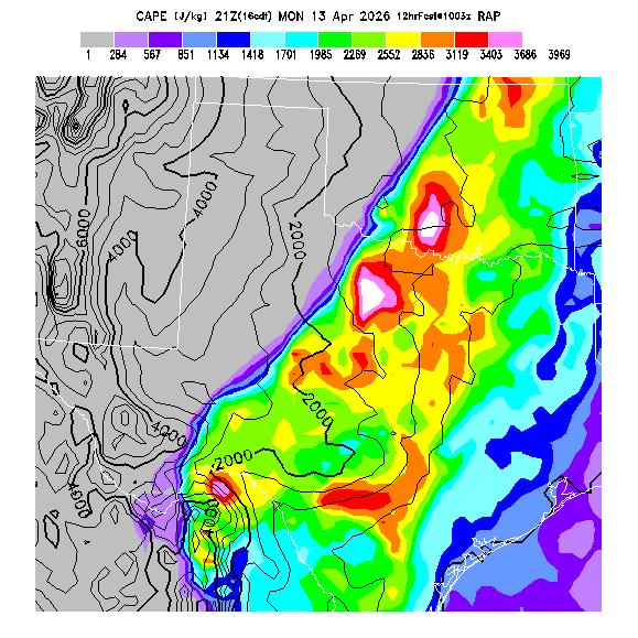 Convective Available Potential Energy indicates the atmospheric stability affecting deep convective cloud formation above the BL.  A higher value indicates greater potential instability, larger updraft velocities within deep convective clouds, and greater potential for thunderstorm development (since a trigger is needed to release that potential).  Note that thunderstorms may develop in regions of high CAPE and then get transported downwind to regions of lower CAPE.  Also, locations where both convergence and CAPE values are high can be subject to explosive thunderstorm development.   MoreInfo