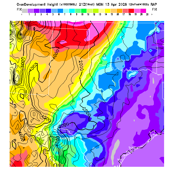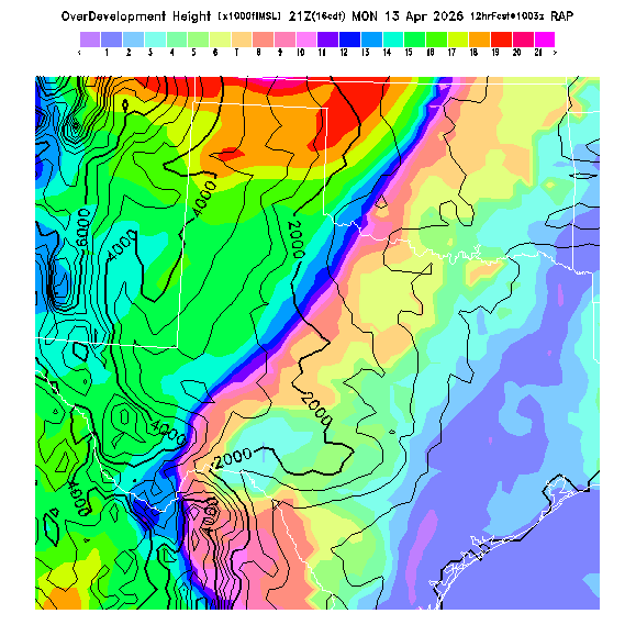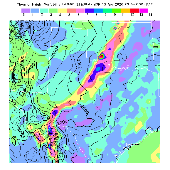 Height of the average dry thermal tops, or Thermal Index TI=0 height.  Over flat terrain maximum thermalling heights will be lower due to the glider descent rate and other factors.  However, thermal tops will be higher over small-scale topography not resolved by the model and some pilots have reported that in elevated terrain the heights they can reach over local terrain features correspond better with the TI=0 height than with Hcrit.  In the presence of clouds the thermal top will increase, but the maximum thermalling height will then be limited by the cloud base (see the "Cloud prediction parameters" section below).  [This parameter is truncated at 22,000 for plotting.]   MoreInfo