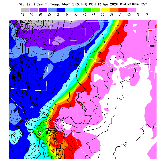 This model-predicted surface dew point temperature can be compared to the actual dew point temperature at 2m during the day to evaluate the accuracy of model moisture predictions.  MoreInfo
