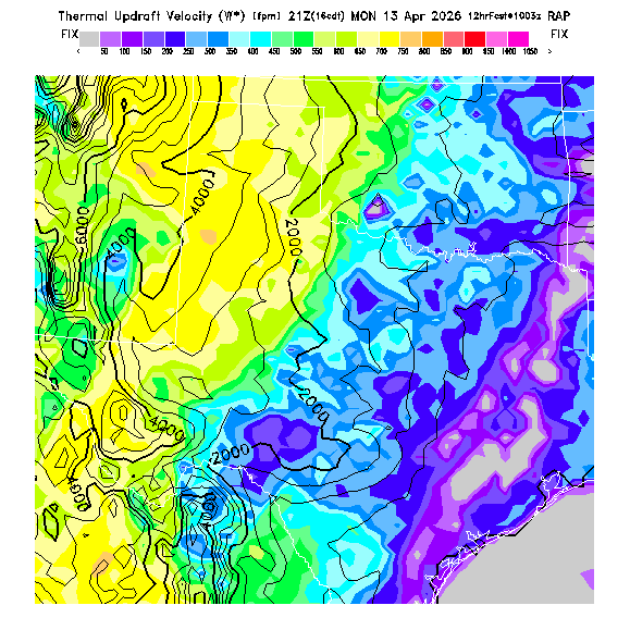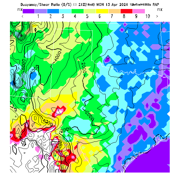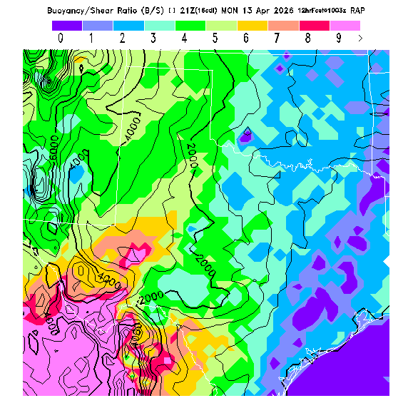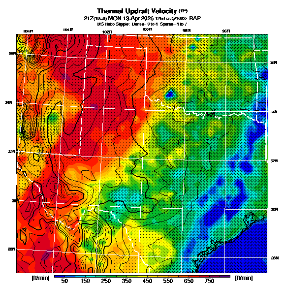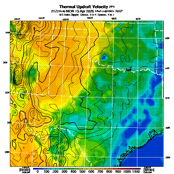 B/S Ratio stippling (dense=0-4 sparse=4-7) overlays Thermal Updraft Velocity contours to indicate where strong thermals can be broken by vertical wind shear.  See "Thermal Updraft Velocity" and "Buoyancy/Shear Ratio" parameter descriptions below for more information.