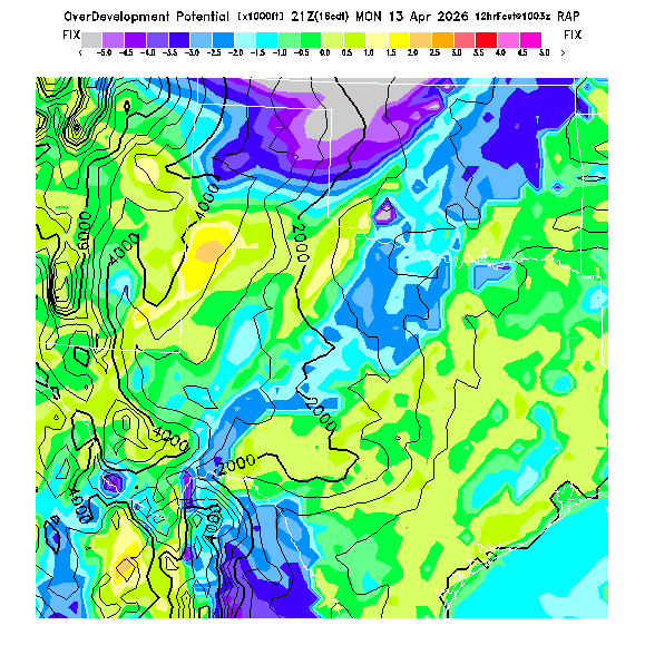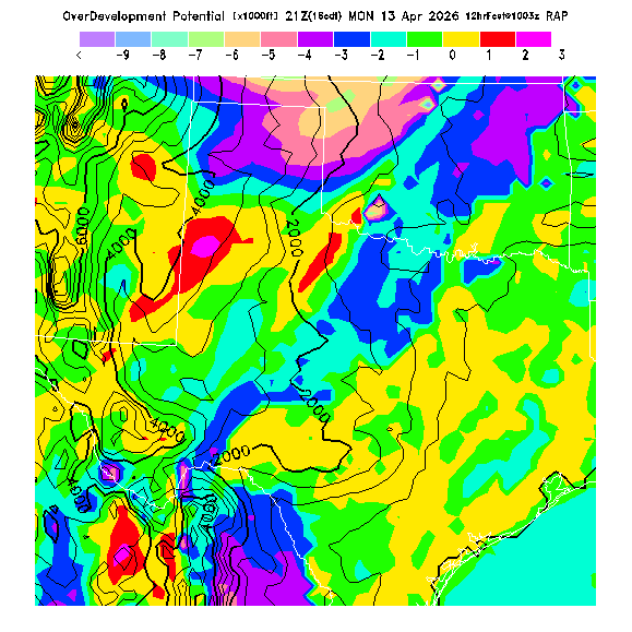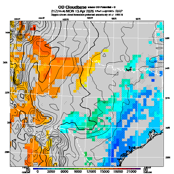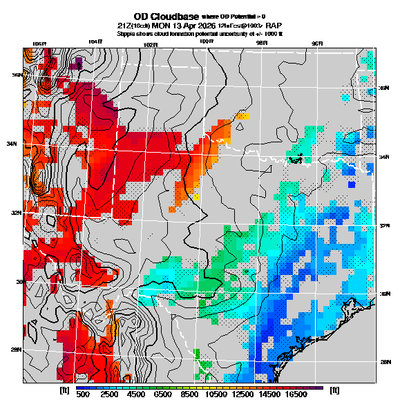 OvercastDevelopment Cloudbase Cloudbase contours are plotted only where that cloudbase is theoretically expected.  See "OvercastDevelopment Potential" and "OvercastDevelopment Cloudbase" parameter descriptions below for more information.  This composite is useful only for locations where the actual potential threshold for OD cloud production agrees with the theoretically-predicted value of zero.