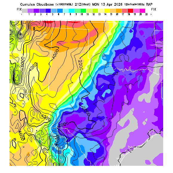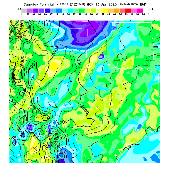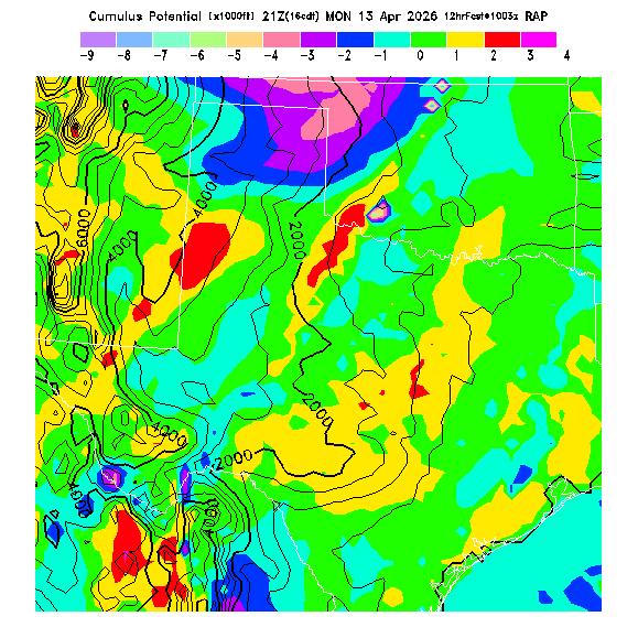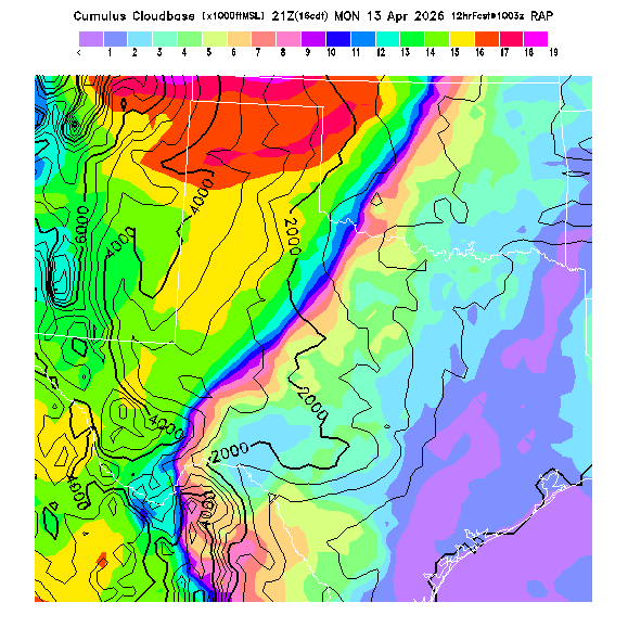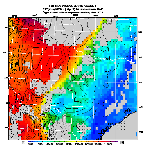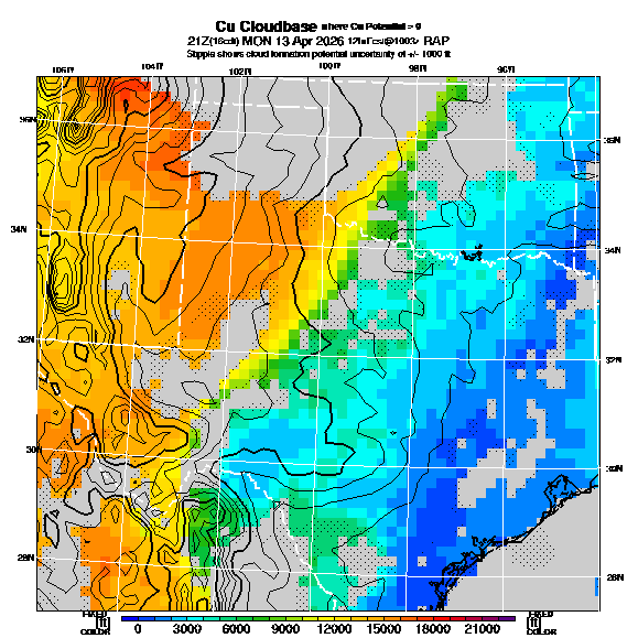 Cu Cloudbase Cloudbase contours are plotted only where that cloudbase is theoretically expected.  See "Cumulus Potential" and "Cumulus Cloudbase" parameter descriptions below for more information.  This composite is useful only for locations where the actual potential threshold for cumulus cloud production agrees with the theoretically-predicted value of zero.