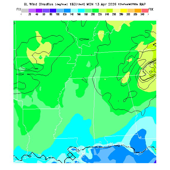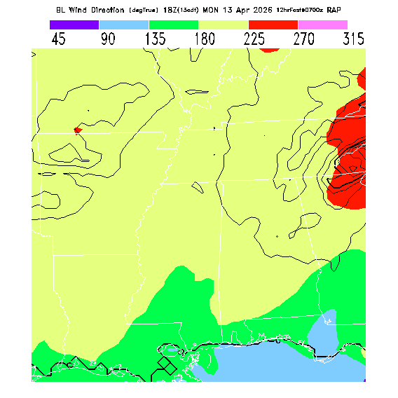 The direction of the vector-averaged wind in the BL.  This prediction can be misleading if there is a large change in wind direction through the BL (for a complex wind profile, any single number is not an adequate descriptor!).  Note that there will be a abrupt artificial gradient at the "cross-over" between 0 and 360 degrees.  MoreInfo