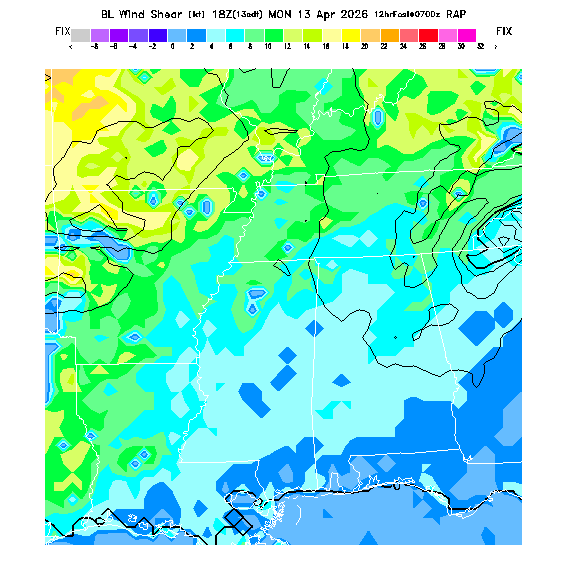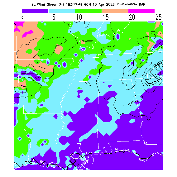 The magnitude of the vector wind difference between the top and bottom of the BL.  Note that this represents vertical wind shear and does not indicate "shear lines" (which are horizontal changes of wind speed/direction).  MoreInfo