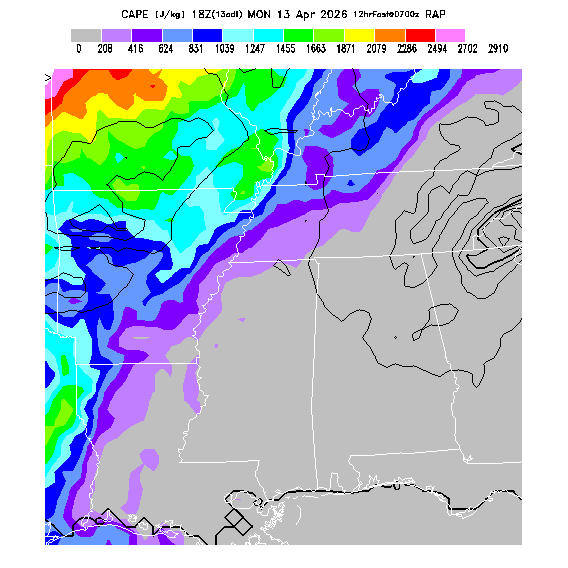 Convective Available Potential Energy indicates the atmospheric stability affecting deep convective cloud formation above the BL.  A higher value indicates greater potential instability, larger updraft velocities within deep convective clouds, and greater potential for thunderstorm development (since a trigger is needed to release that potential).  Note that thunderstorms may develop in regions of high CAPE and then get transported downwind to regions of lower CAPE.  Also, locations where both convergence and CAPE values are high can be subject to explosive thunderstorm development.   MoreInfo