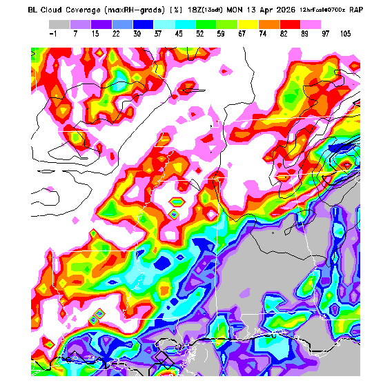 This parameter provides an additional means of evaluating the formation of clouds within the BL and might be used either in conjunction with or instead of the other cloud prediction parameters.  Larger values indicate greater cloud probability, but use of this parameter must be empirical since no theoretical guidance is available - for example, pilots must determine by actual experience the percentage that correlates with formation of clouds above local mountains.  The cloud base height is not predicted, but is expected to be below the TI=0 height.  MoreInfo