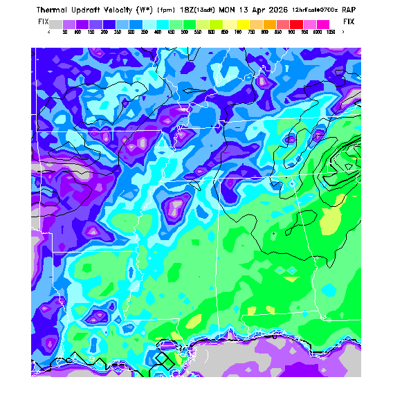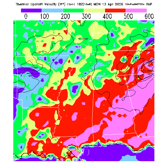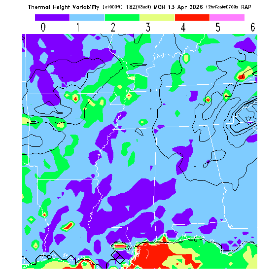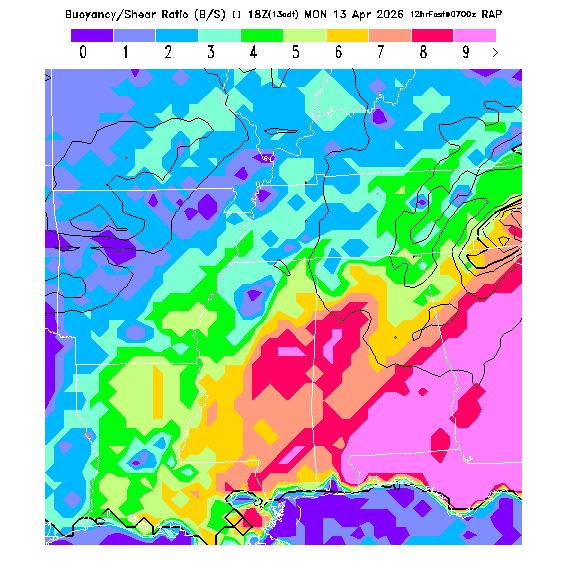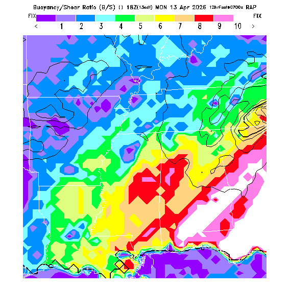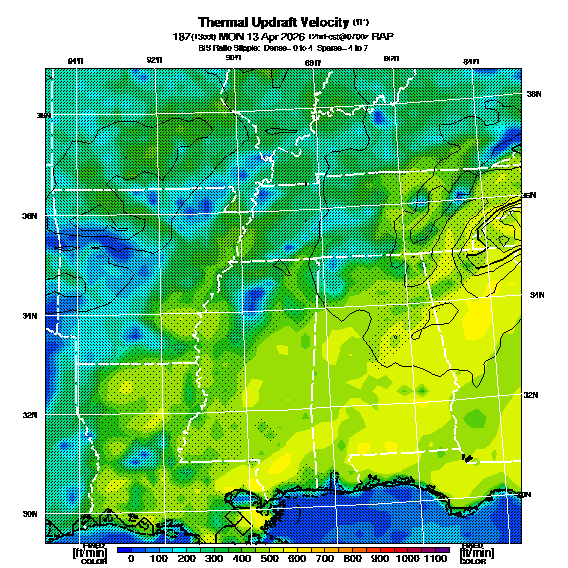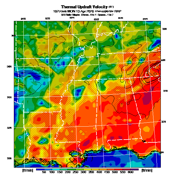 B/S Ratio stippling (dense=0-4 sparse=4-7) overlays Thermal Updraft Velocity contours to indicate where strong thermals can be broken by vertical wind shear.  See "Thermal Updraft Velocity" and "Buoyancy/Shear Ratio" parameter descriptions below for more information.
