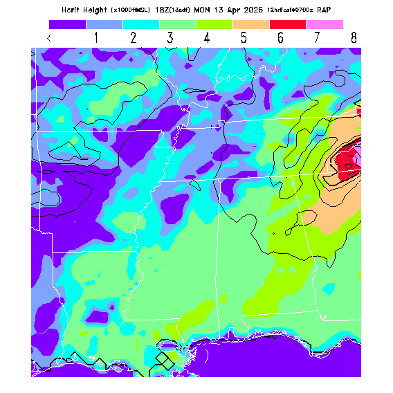 Height of the average dry thermal tops, or Thermal Index TI=0 height.  Over flat terrain maximum thermalling heights will be lower due to the glider descent rate and other factors.  However, thermal tops will be higher over small-scale topography not resolved by the model and some pilots have reported that in elevated terrain the heights they can reach over local terrain features correspond better with the TI=0 height than with Hcrit.  In the presence of clouds the thermal top will increase, but the maximum thermalling height will then be limited by the cloud base (see the "Cloud prediction parameters" section below).  [This parameter is truncated at 22,000 for plotting.]   MoreInfo