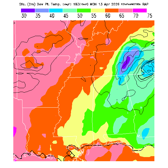 This model-predicted surface dew point temperature can be compared to the actual dew point temperature at 2m during the day to evaluate the accuracy of model moisture predictions.  MoreInfo