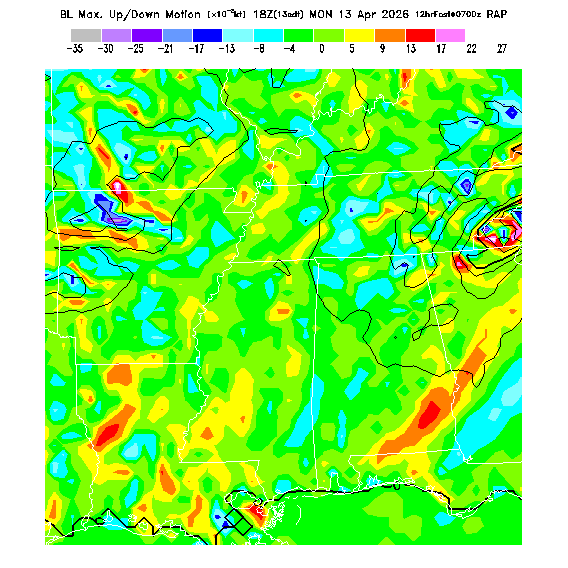 Maximum grid-area-averaged extensive upward or downward motion within the BL as created by horizontal wind convergence.  Positive convergence is associated with local small-scale convergence lines (often called "shear lines" by pilots, meaning horizontal changes of wind speed/direction) - however, the actual size of such features is much smaller than can be resolved by the model so only stronger ones will be forecast and their predictions are subject to much error.  If CAPE is also large, thunderstorms can be triggered.  Negative convergence (divergence) produces subsiding vertical motion, creating low-level inversions which limit thermalling heights.  This parameter can be noisy, so users should be wary.  MoreInfo
