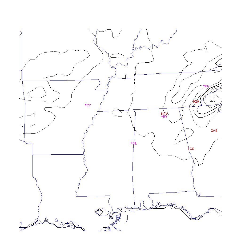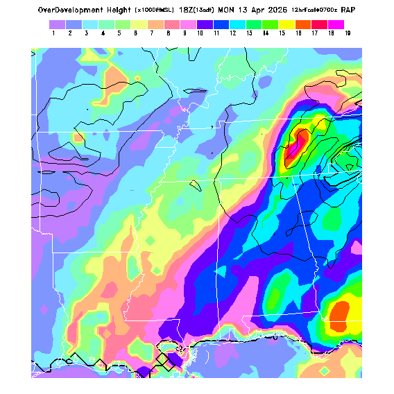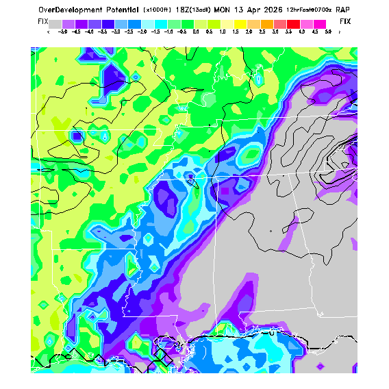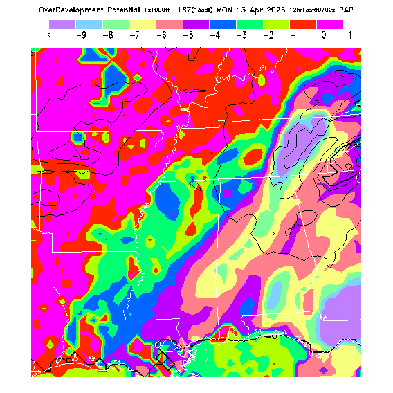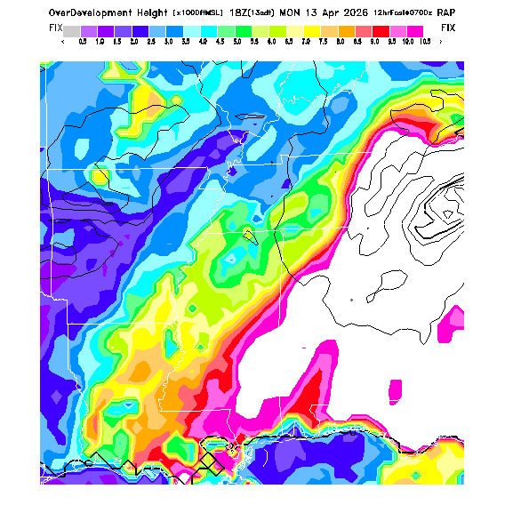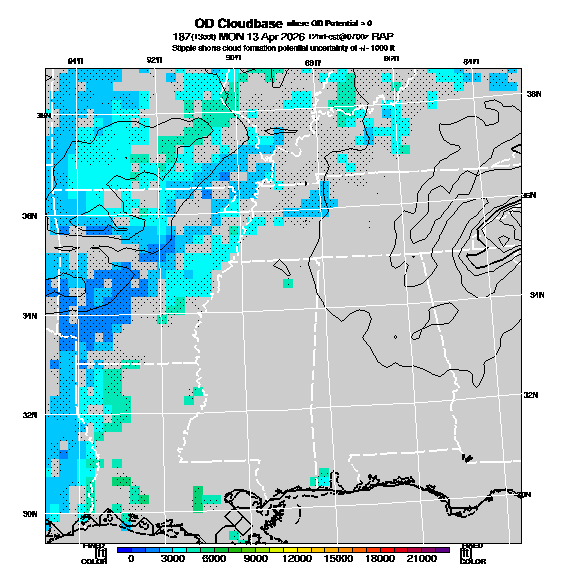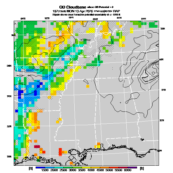 OvercastDevelopment Cloudbase Cloudbase contours are plotted only where that cloudbase is theoretically expected.  See "OvercastDevelopment Potential" and "OvercastDevelopment Cloudbase" parameter descriptions below for more information.  This composite is useful only for locations where the actual potential threshold for OD cloud production agrees with the theoretically-predicted value of zero.