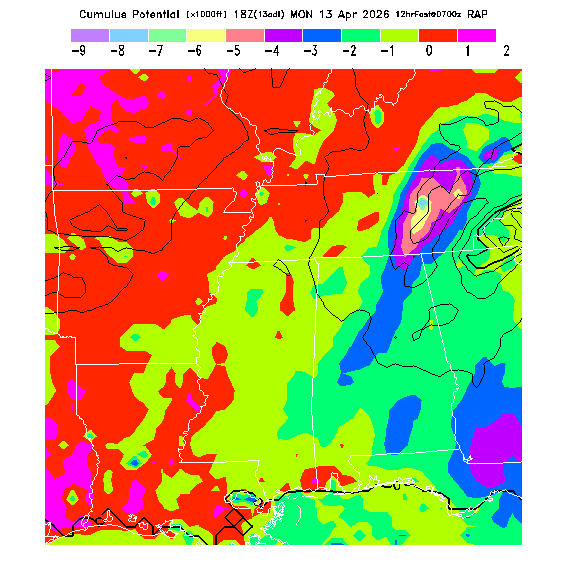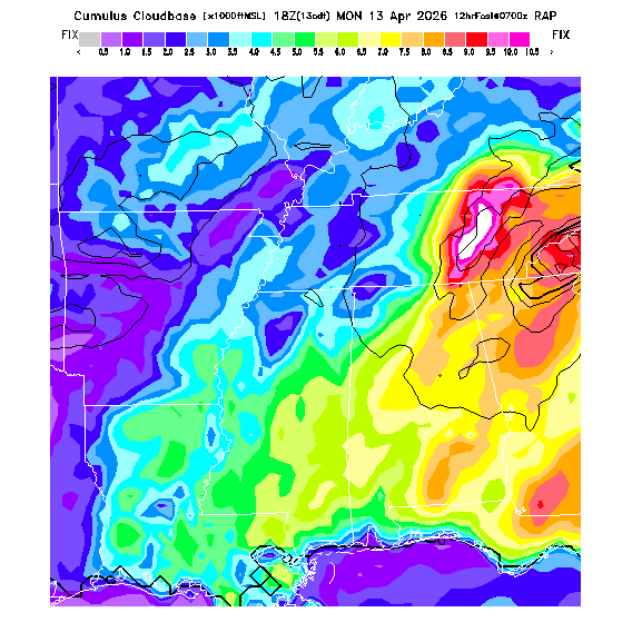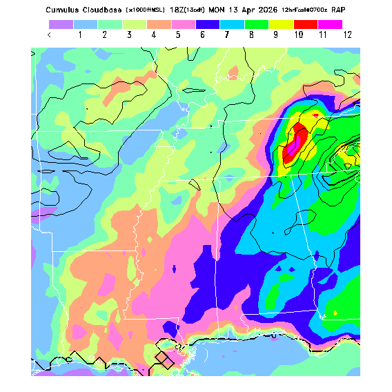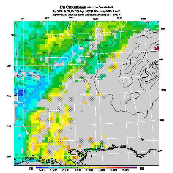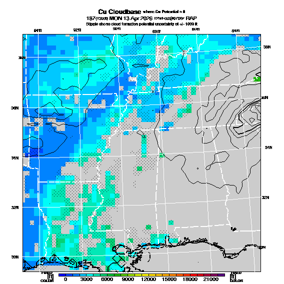 Cu Cloudbase Cloudbase contours are plotted only where that cloudbase is theoretically expected.  See "Cumulus Potential" and "Cumulus Cloudbase" parameter descriptions below for more information.  This composite is useful only for locations where the actual potential threshold for cumulus cloud production agrees with the theoretically-predicted value of zero.