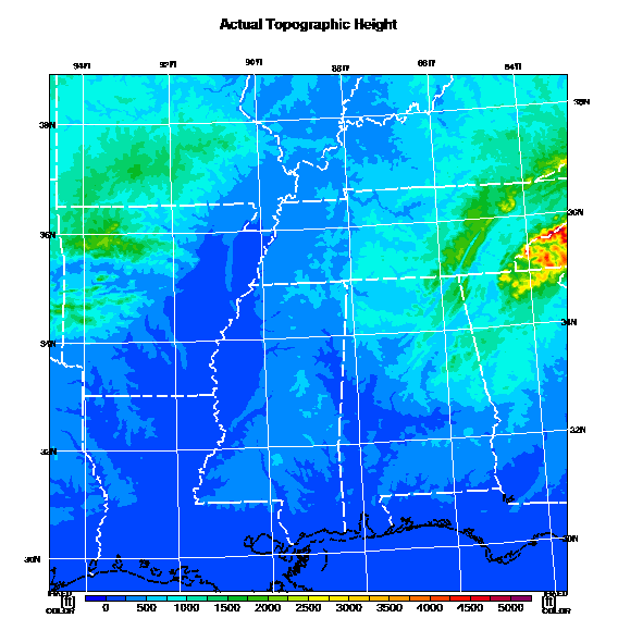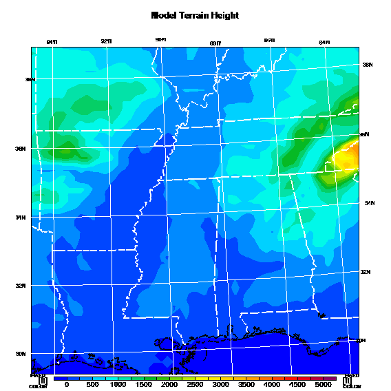 State outlines are depicted on each BLIPMAP in white.  The RAP topography is plotted as black contours, at 500 ft intervals with thicker lines at 2000 ft intervals, to assist in location identification but also to emphasize the smoothed nature of the model topography.  The BLIPMAP does not predict thermal lift created by small-scale terrain features which are not resolved by the model topography, which often give localized updrafts significantly stronger than those over the surrounding smoother terrain.  Maps of location identifiers and additional topography information for this region are available at the SC Grid Orientation webpage.