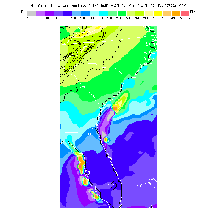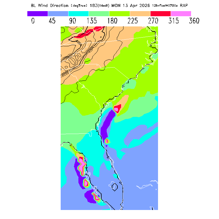 The direction of the vector-averaged wind in the BL.  This prediction can be misleading if there is a large change in wind direction through the BL (for a complex wind profile, any single number is not an adequate descriptor!).  Note that there will be a abrupt artificial gradient at the "cross-over" between 0 and 360 degrees.  MoreInfo