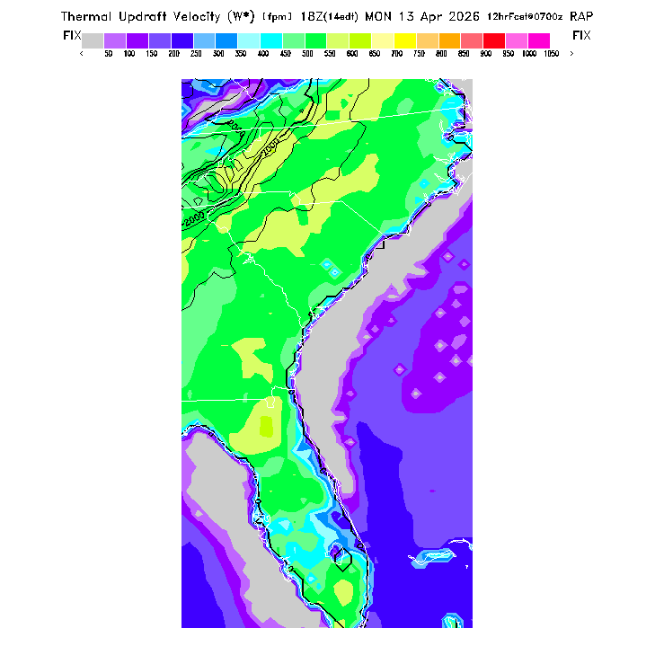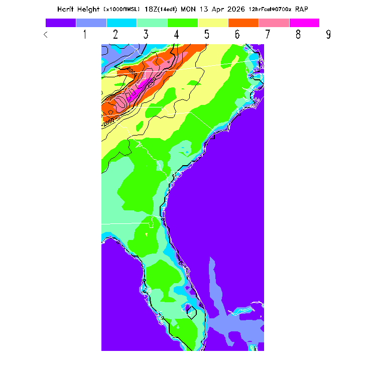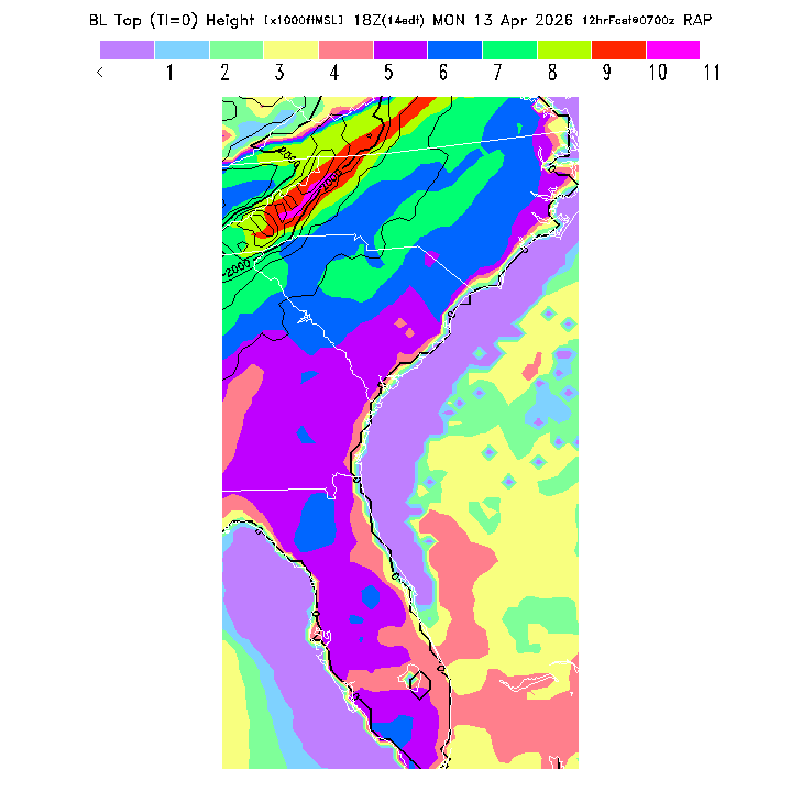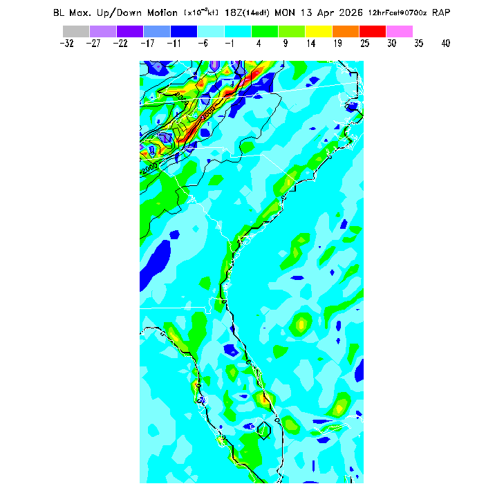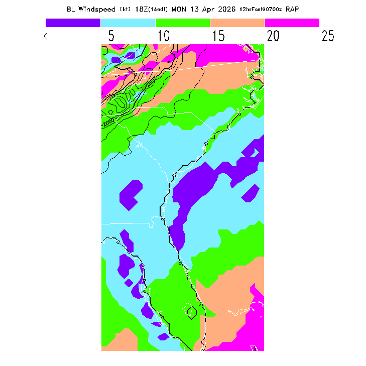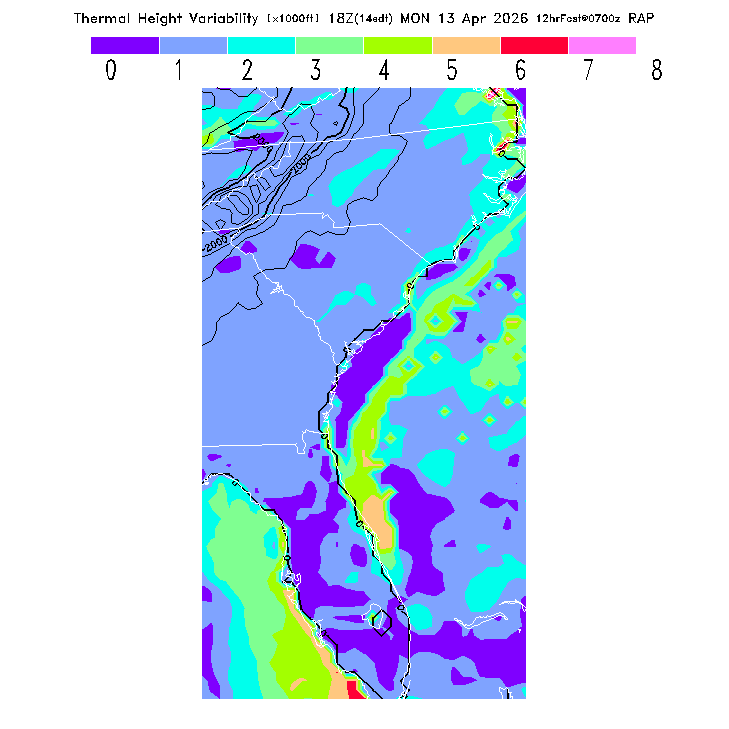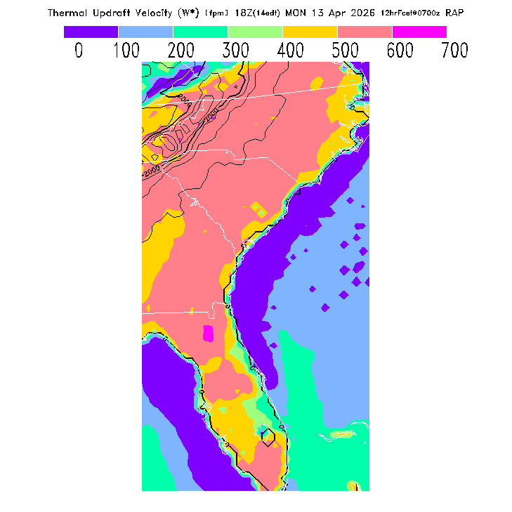 State outlines are depicted on each BLIPMAP in white.  The RAP topography is plotted as black contours, at 500 ft intervals with thicker lines at 2000 ft intervals, to assist in location identification but also to emphasize the smoothed nature of the model topography.  The BLIPMAP does not predict thermal lift created by small-scale terrain features which are not resolved by the model topography, which often give localized updrafts significantly stronger than those over the surrounding smoother terrain.  Maps of location identifiers and additional topography information for this region are available at the SE Grid Orientation webpage.