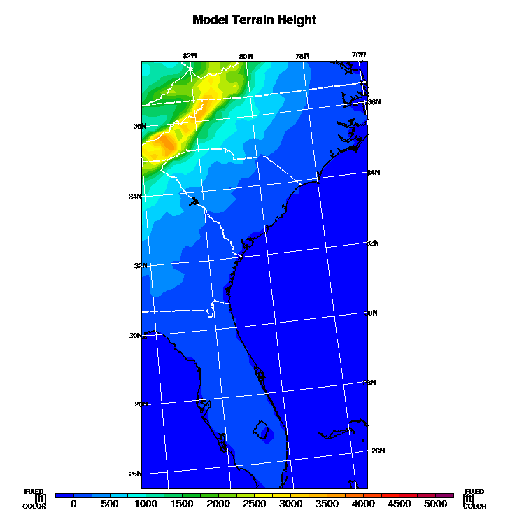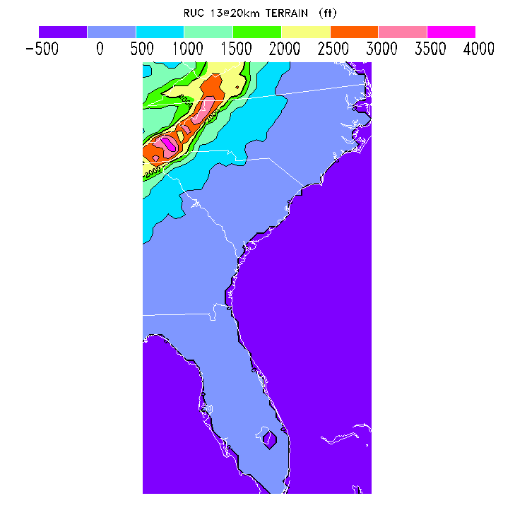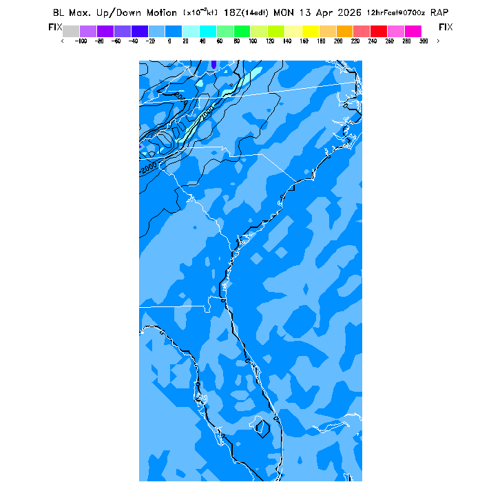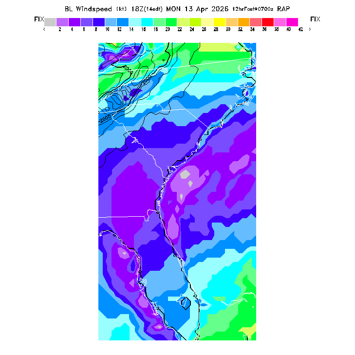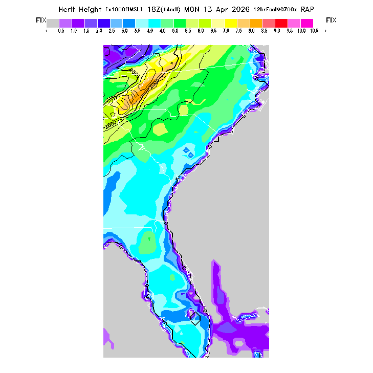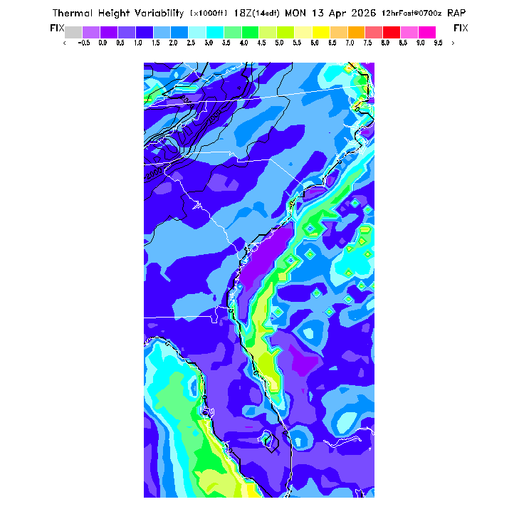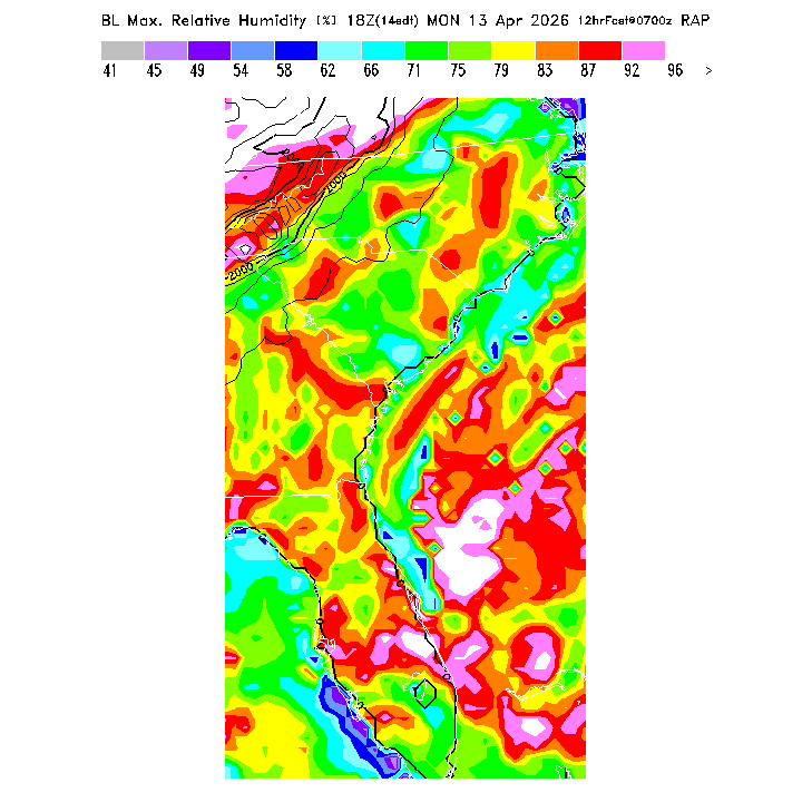 State outlines are depicted on each BLIPMAP in white.  The RAP topography is plotted as black contours, at 500 ft intervals with thicker lines at 2000 ft intervals, to assist in location identification but also to emphasize the smoothed nature of the model topography.  The BLIPMAP does not predict thermal lift created by small-scale terrain features which are not resolved by the model topography, which often give localized updrafts significantly stronger than those over the surrounding smoother terrain.  Maps of location identifiers and additional topography information for this region are available at the SE Grid Orientation webpage.